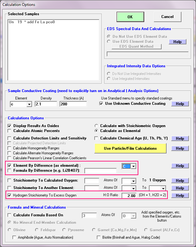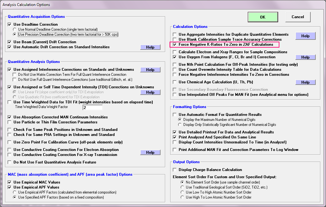 for the "element by difference", "formula by difference" and the "hydrogen by stoichiometry to excess oxygen" calculations (this flag was already being utilized in the "element by difference" calculation, so this merely makes the other calculations statistically similar).  The default will be to allow negative concentrations of these elements to be included in the matrix correction for improved average statistics. But when the Force Negative K-Ratios To Zero checkbox is checked, it will only allow positive concentrations to be included in the matrix correction calculations. This being to deal with non-ideal physical situations when mapping many pixels in a quant map.