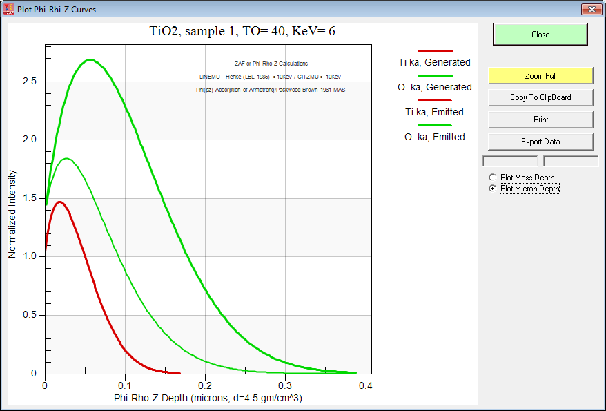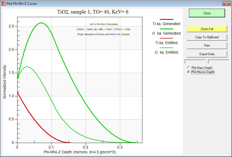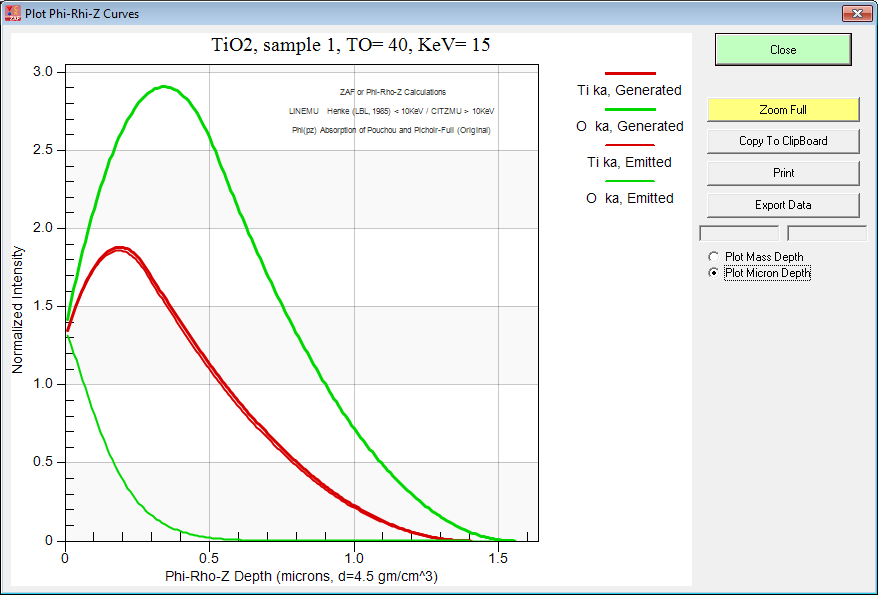So we used the phi-rhi-z curve plot feature in CalcZAF(!) to try and see where the emitted x-rays are coming from. For reference here is what TiO2 looks like at typical EPMA beam energies (15 keV):