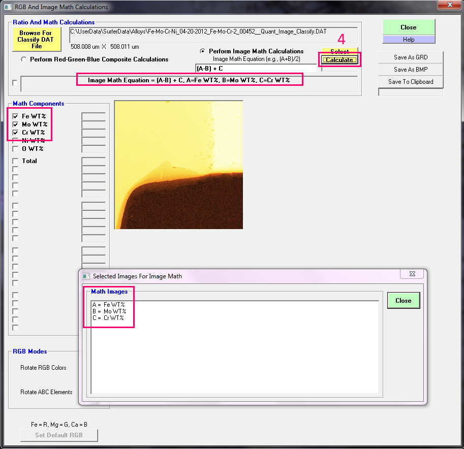 To explain. I have a map of sulphur in steel and I want to subtract the measured background from it before quantifying it. So I opened image calculation selected the A, B, C images. Then for image A performed the operation A-739.9 it displays the recalculated picture all looks fine but when I click "Save as GRD" it comes up with message "File Not Found". I admit this is not what you'd normally do or its designed to do