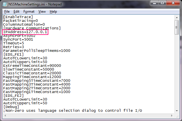 Then edit the IPAddress keyword for the "loopback" address (there's no place like home!) so the software knows that it is running without an actual EDS detector as seen here: