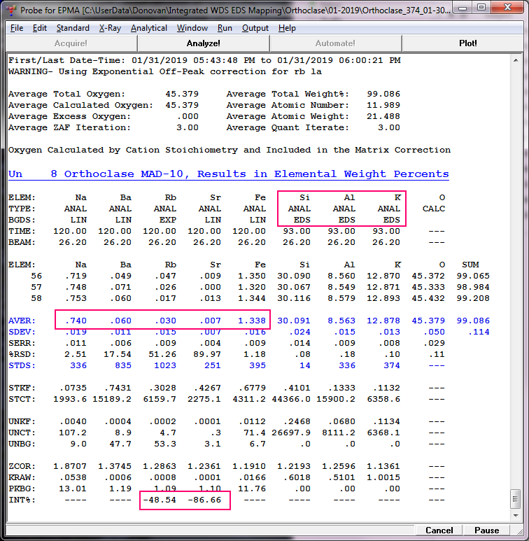 Just as an aside, note that this quant utilized Si by EDS for the interference by silicon on Sr La (by WDS), and also utilized K by EDS for the interference by potassium (satellite II order) on Rb La (by WDS).   8)