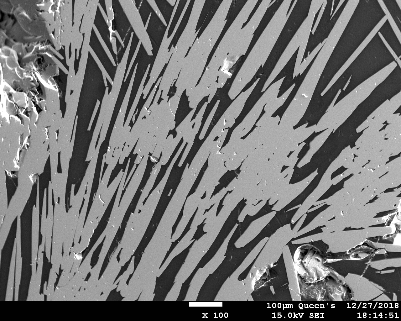 Another problem I encountered was that the Li2B4O7 flux that I used in the synthesis of Bi2WO6 (russellite) reacted readily with the alumina crucible and made it impossible to remove the crystals without breaking the crucible (hence the need for a new crucible for the CdWO4 synthesis).  As you can see below, the Bi2WO6 produced some pretty cool textures.  The crystals are not acicular, but rather are platy and oriented at high angle to the plane of section.