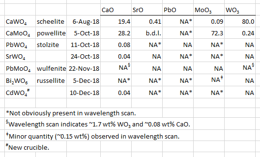 Overall I'm a little disappointed with the results, as I apparently was unable to remove impurities sufficiently from the crucible after each run, even when scrubbing with emery paper.  The worst case was the synthetic wulfenite (PbMoO4), which contains substantial WO3 -- I didn't bother to do quantitative analyses of it.  I prepared it in a two-step process in order to combat problems with volatility of both PbO and MoO3:  in the first step, I synthesized fine-grained material via solid-state reaction by heating to 1000°C and holding at that temperature for 48 hours.  When heated quickly to relatively high temperature, the oxides react quickly enough that little evaporation or sublimation occurs.  I then attempted to obtain coarser crystals by dissolving it in Na2MoO4 and then cooling slowly.  While I was able to dissolve the PbMoO4 without any problem, it never re-precipitated.  However, the grains produced by the solid-state reaction measure up to a few hundred microns across, and so I was able to mount and examine this material without any difficulty.