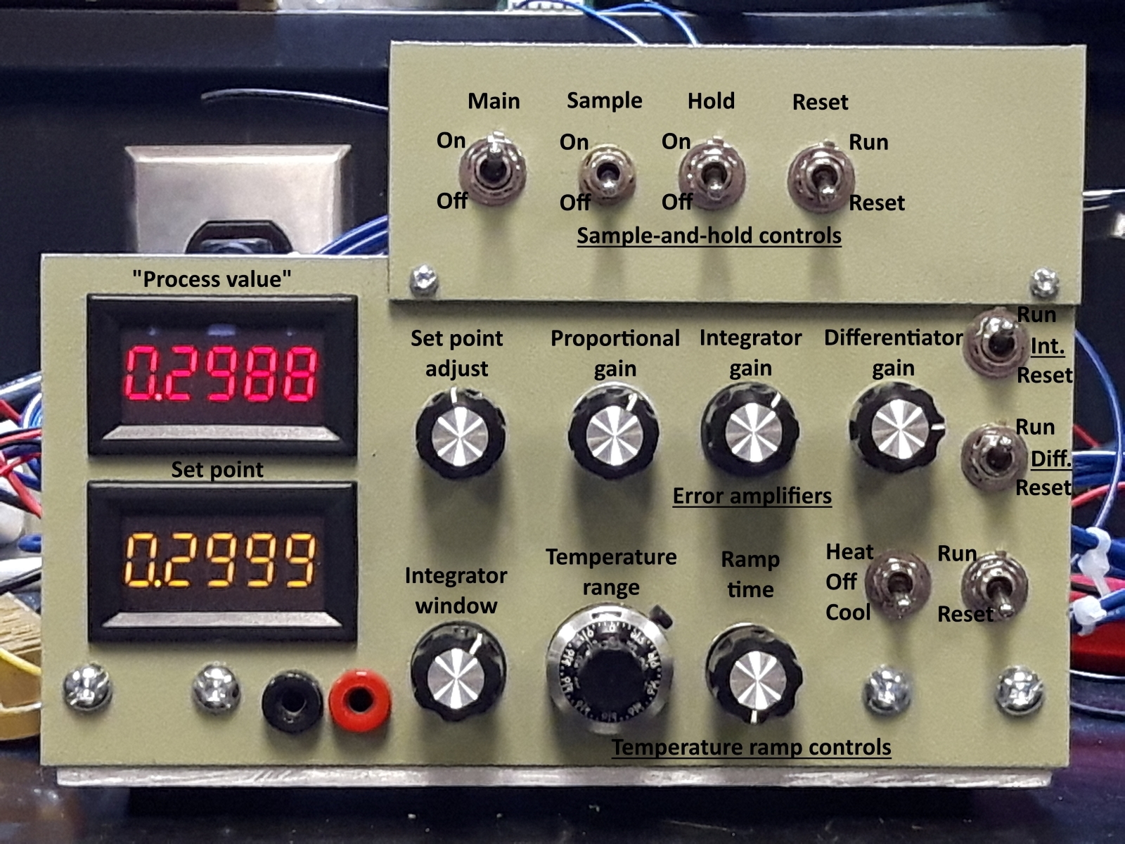 Unfortunately, my Omega digital temperature controller decided to start spitting out an error code that doesn't seem to make any sense, especially since the "error" occurs only when the temperature is stable.  This forced me to press into service an analog controller that I've been building and testing over the past few months.  I took the photo below while testing it at 60°C (which gives a reading of ~300 mV) using a hollow, wirewound power resistor as the "furnace," with the thermocouple probe placed inside the tube.  For this relatively responsive "furnace," I can get the temperature stable to within about 0.2°C with appropriate settings of the error amplifiers.  I actually had intended to place this controller in a box, but, as you can see, the control panel managed to outgrow itself.