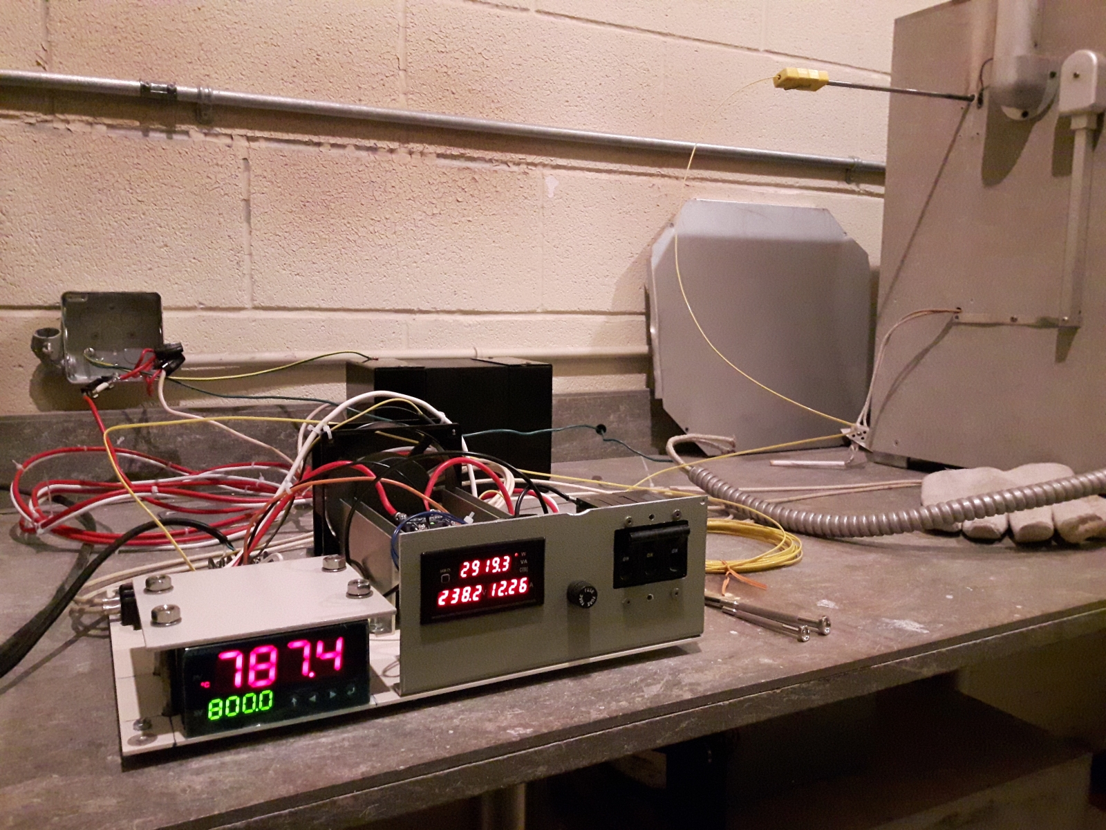 I've now connected my temperature controller assembly directly to the heating elements of an old Gallenkamp muffle furnace after disconnecting its internal circuitry (see photo below).  The black, rectangular box next to the wall is a 7.5 kVA autotransformer that I've used to bump the AC line voltage up from ~210 V to around 235 V (the meter is reading a little high).  Of course my setup is totally CSA approved ;D.  (But really I do take safety seriously.  The furnace is located in a small, locked room to which only a handful of people have access, and all of them know what I'm up to.)  At any rate, since the furnace heating elements are just resistors, the autotransformer allows me to draw more current and provide more power to the furnace.  However, the resistance of the heating elements increases with increasing temperature such that power consumption falls from ~3.2 kW at room temperature to ~2.8 kW at 1000ºC.  Still, it's now much easier for me to get to ~1000ºC relatively quickly.  One thing I didn't think about ahead of time is that the furnace is large enough that its thermal response to an input of energy is so exceedingly slow that this makes the controller error amplifiers very difficult to tune appropriately; this can make the cooling ramp rate difficult to set precisely.  I've worked out a design for an analog controller that I'm planning to construct this fall, and this will allow me to explore different methods of temperature control; I'll be able to add in a single ramp through slow charge/discharge of a film capacitor.