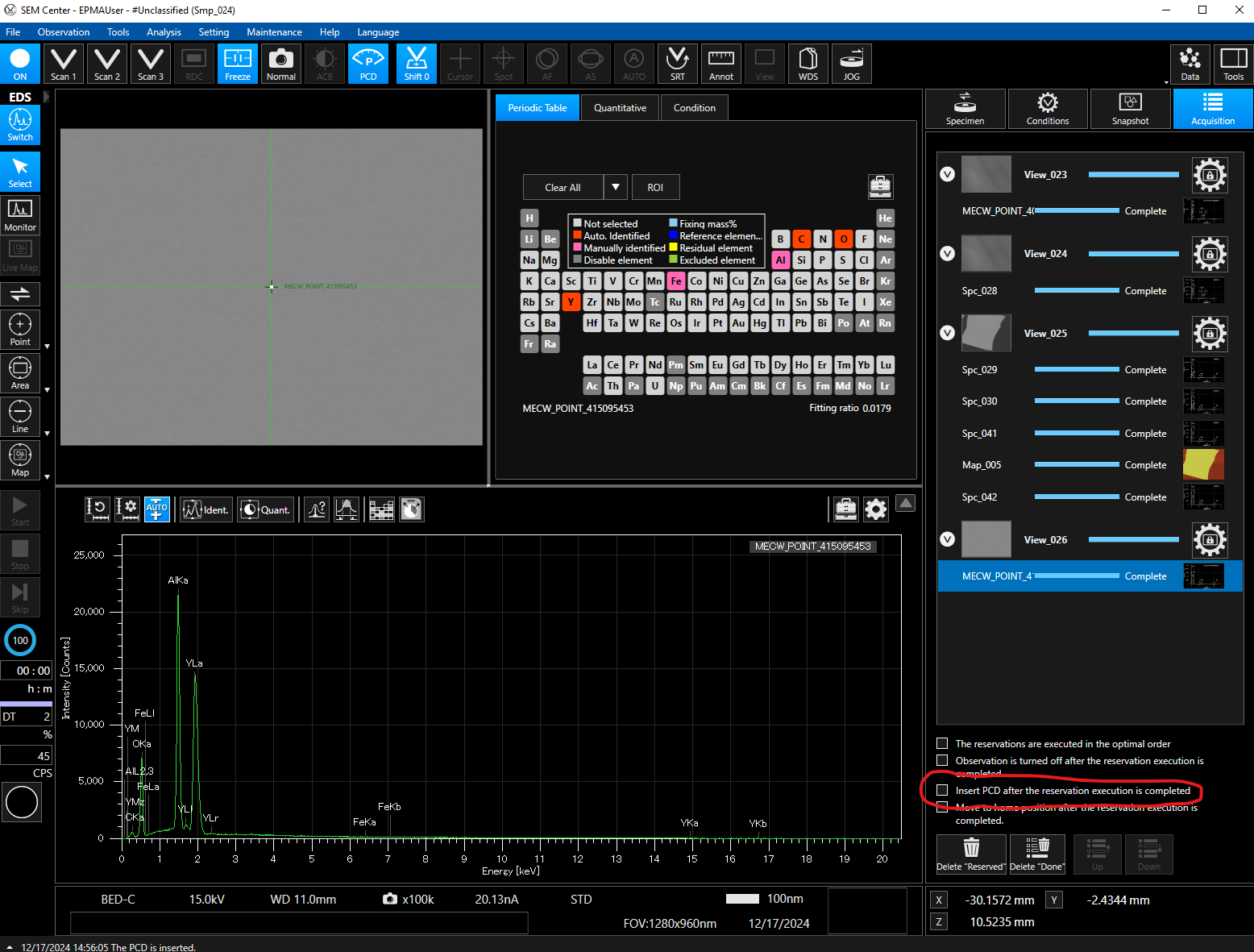 At acquisition time, the EDS spectrum for each point analysis is stored in the local PFE database obtained from the JEOL (and Thermo and Bruker) server software. At that time (unless turned off by the user during automation as described above), PFE also obtains the net intensities for each EDS element and also stores those net intensities locally.