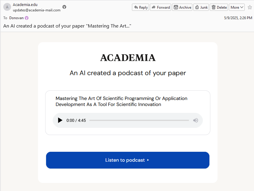 Has anyone else seen this sort of thing from Academia.edu? The odd part is that when I listened to the podcast, it didn't sound like an AI, in fact the voice says "This is Richard Price, CEO of Academia.edu", so why say "an AI created..."!?  And also it was a bit disorganized and rambling too.  Take a listen and tell us whether you think this was an AI voice...