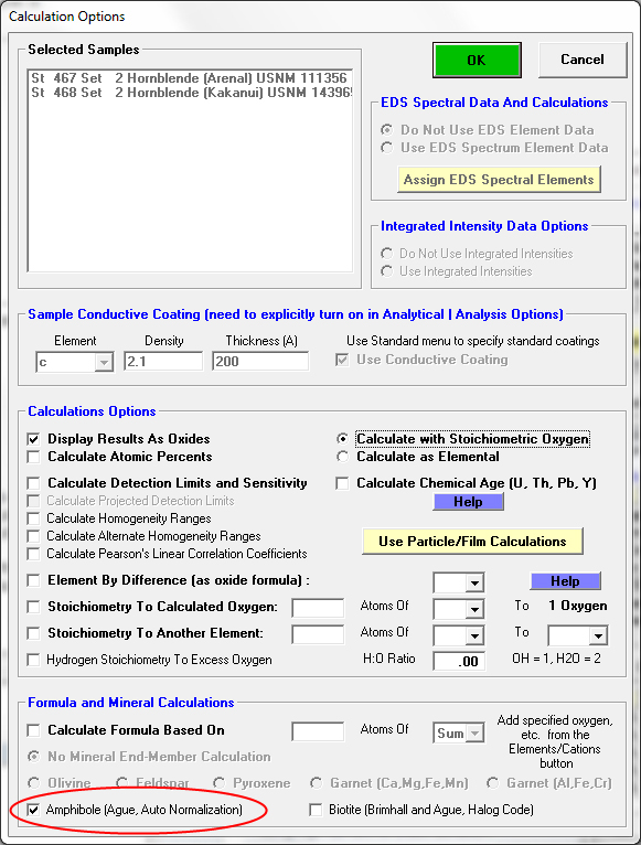 In case anyone is interested in amphibole calculations there is an option for site occupancy in amphiboles and biotites in PFE in the Calculation Options dialog as seen here: