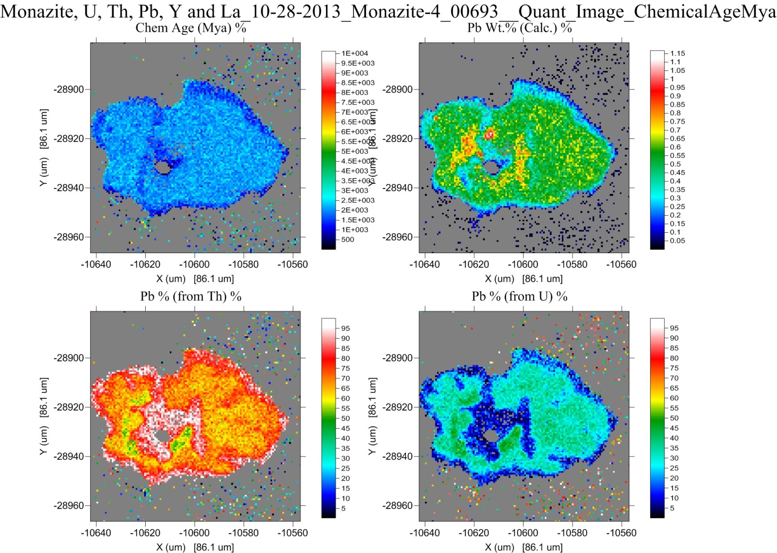 which reveal the chemical age (lower right), Pb from U (upper left), Pb from Th (lower left) and calculated Pb (upper right). The presentation output from the Project menu is seen here: