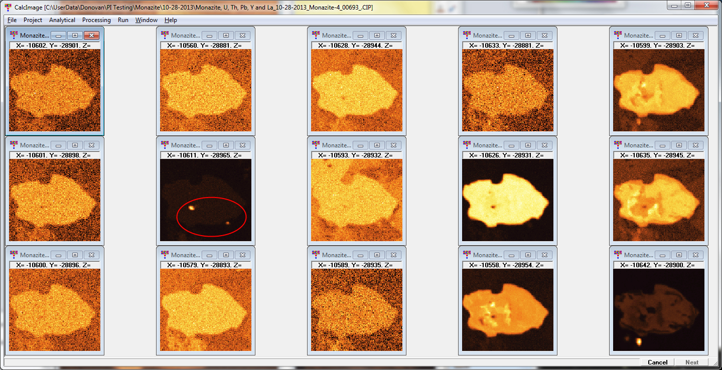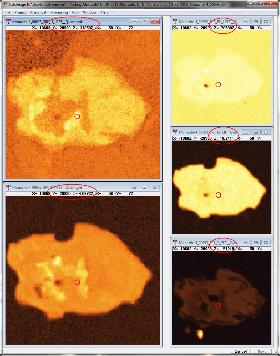 The following screen shot shows the raw data (on and off-peak) for a monazite grain (courtesy of Julien Allaz- Univ of Colorado) for U, Th, Pb, Y and La: