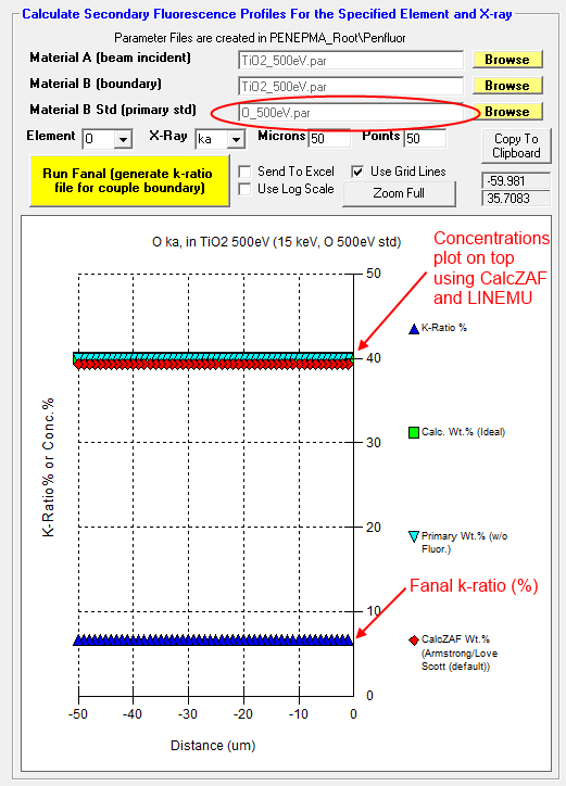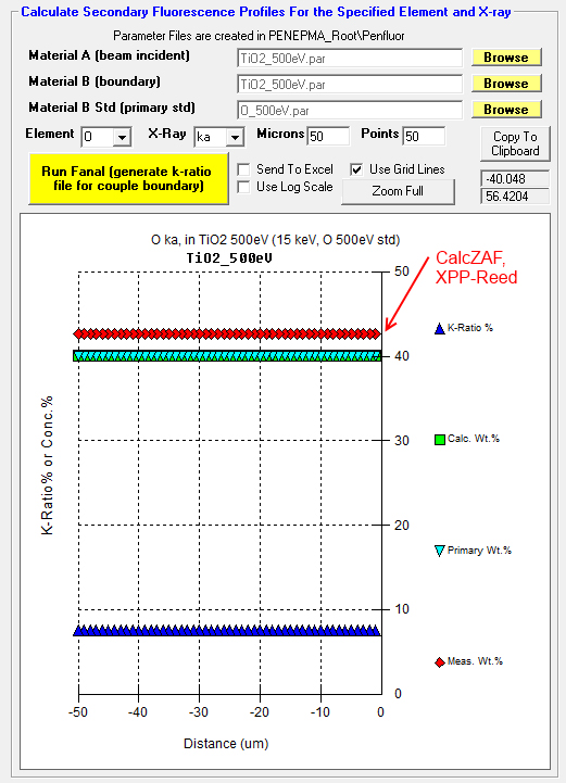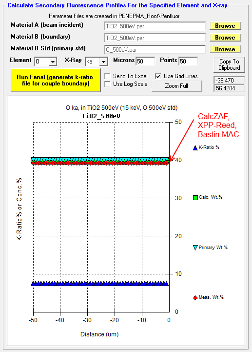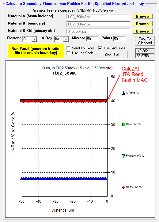I'm going to try both the JTA and XPP analytical models in CalcZAF for O Ka in TiO2 and also apply Bastin's empirical MAC for O Ka in Ti which is 19900. Let's see how these compare to Penepma/Penfluor Monte-Carlo models.
