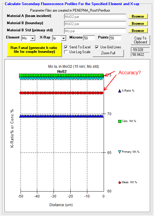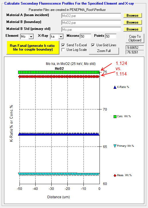 Hey, is someone willing to model Mo La and O Ka in MoO2 at 25 keV in Penepma for us?   Just run the MoO2, pure Mo and pure O (STP) material files at 25 keV in the Penepma12 "batch" window in Standard.exe and let us know what the intensities are for each material (see the pe-intens-01.dat file for each calculation). Explicit instructions for calculating k-ratios from Penepma 2012 runs are found here: