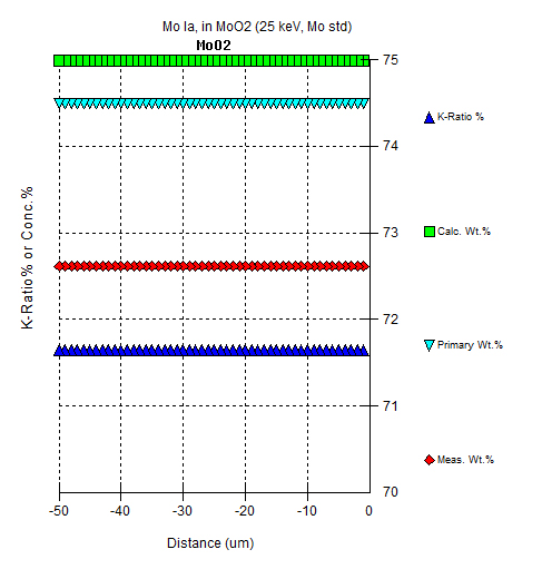 We see another small discrepancy between the MC model (Calc. Wt%) and one of the CalcZAF (JTA-Reed) analytical expressions (Meas. Wt%) for Mo La in MoO2.