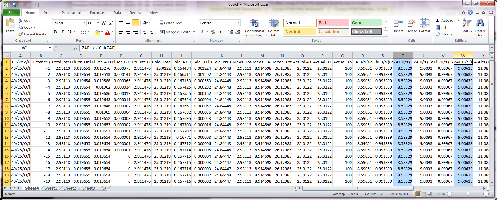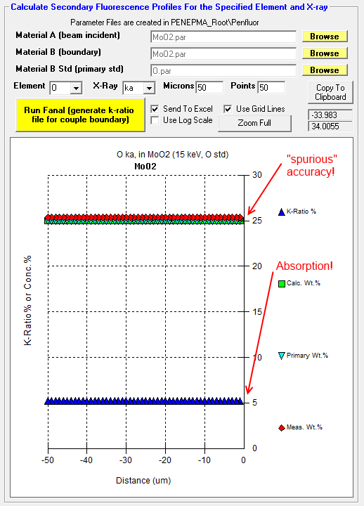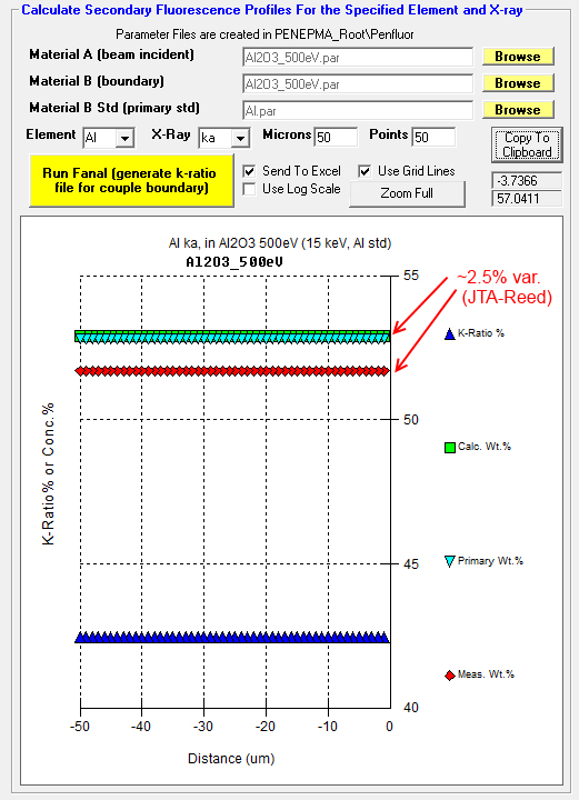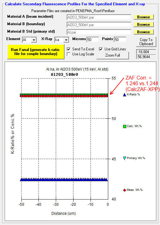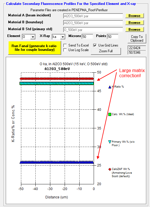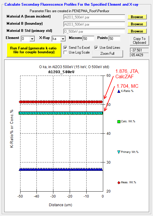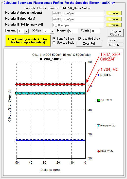 However, just for fun I loaded in an empirical Mass Absorption Coefficient (MAC) value from Bastin (1992) for O Ka in Al (6720) into CalcZAF (see Analytical | Empirical MACs menu) and the ZAF correction factor changed from 1.876 to 1.875, so maybe not!