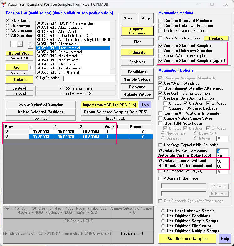 As for your question, well, it would be easy enough to test yourself! But I did a quick test run (in simulation mode) just to see for myself (because I wanted to be sure I was being accurate), and so I set up a test run with two points (same stage coordinates) in my Ti std, then set the X and Y increments to 30 and 50 um respectively (to make it completely clear) as seen here: