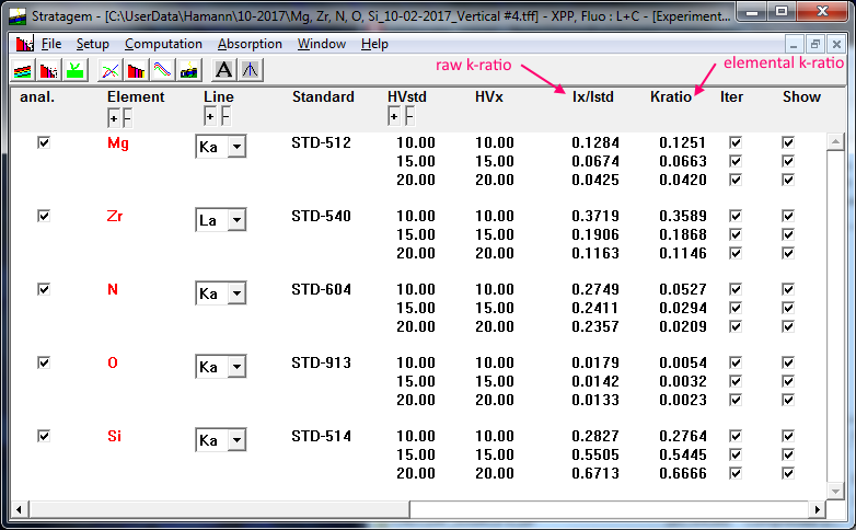 When we click the Iterate menu in STRATAGem the program calculates a model based on all the raw k-ratios at all the beam energies utilized as seen here: