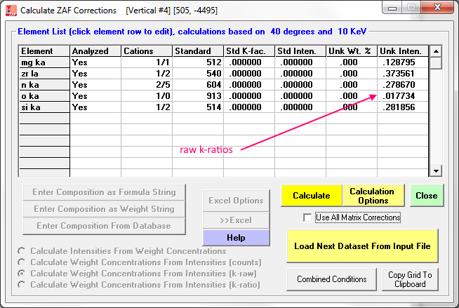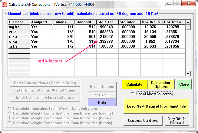 Now let's run CalcZAF and enter our raw k-ratios as seen here, starting with the 10 keV measurements (one could alternatively enter intensities for both the unknowns and standards):