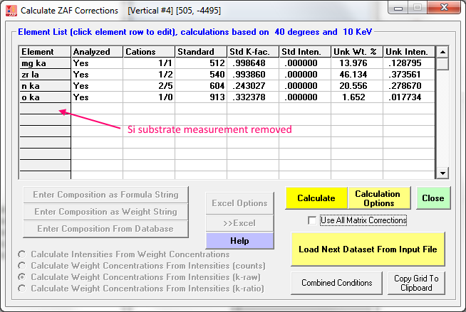 First note that the Calculate Weight Concentrations From Intensities option is selected (though grayed out since an import file was utilized). If you enter raw k-ratios by hand you will want to be sure to select this option before clicking the Calculate button.