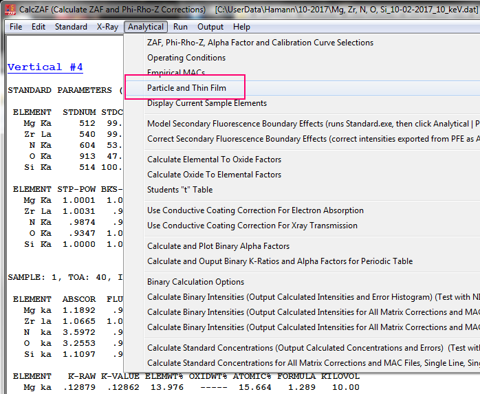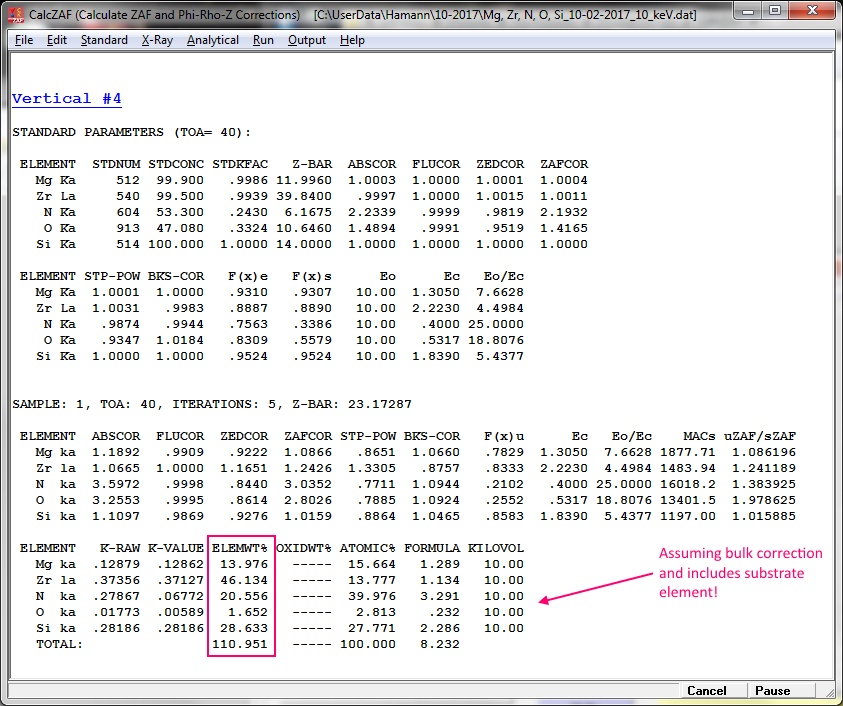 But STRATAGem is not cheap and if one doesn't have the money, one can if necessary, utilize CalcZAF for characterization of thin film samples. The advantage of STRATAGem is that is can utilize multiple keV measurements and also correct for fluorescence between the thin film and the substrate, whereas CalcZAF calculates one keV at a time and assumes no substrate.