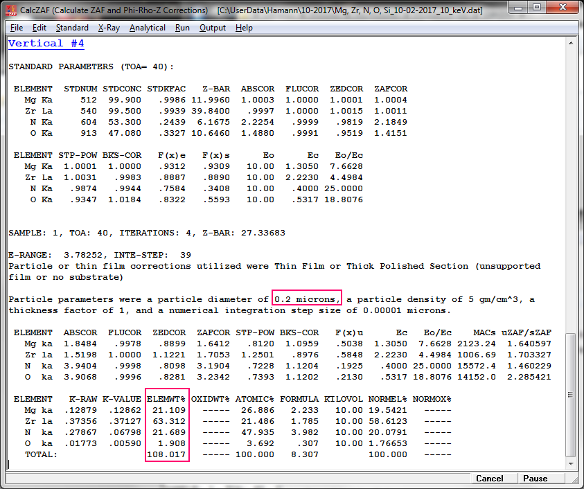 The results are output here (the iteration windows shows a 99.8% un-normalized sum) for normalized concentrations and atom fractions: