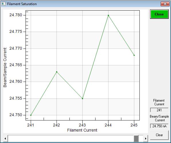One simply clicks the horizontal scroll bar to change the filament current and it automatically plots the beam current for that filament current.