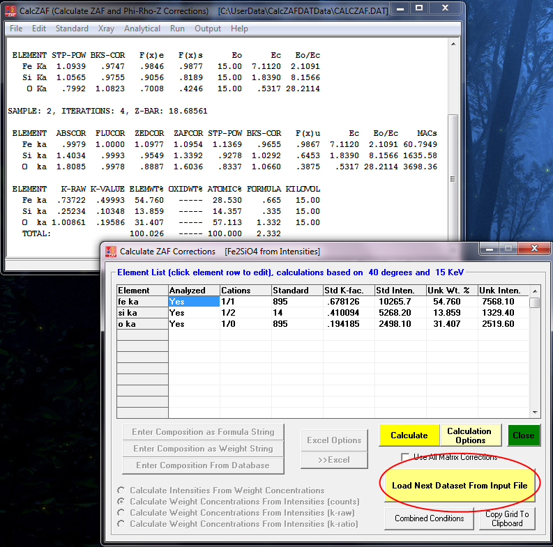 Simply use the Output | Save CalcZAF Format menu in PFE to export your data and re-calculate it in CalcZAF. Note that if you enter a composition in CalcZAF it calculates intensities (k-ratios) from the composition. But if you enter intensities (manually or by importing from PFE), it will calculate concentrations.