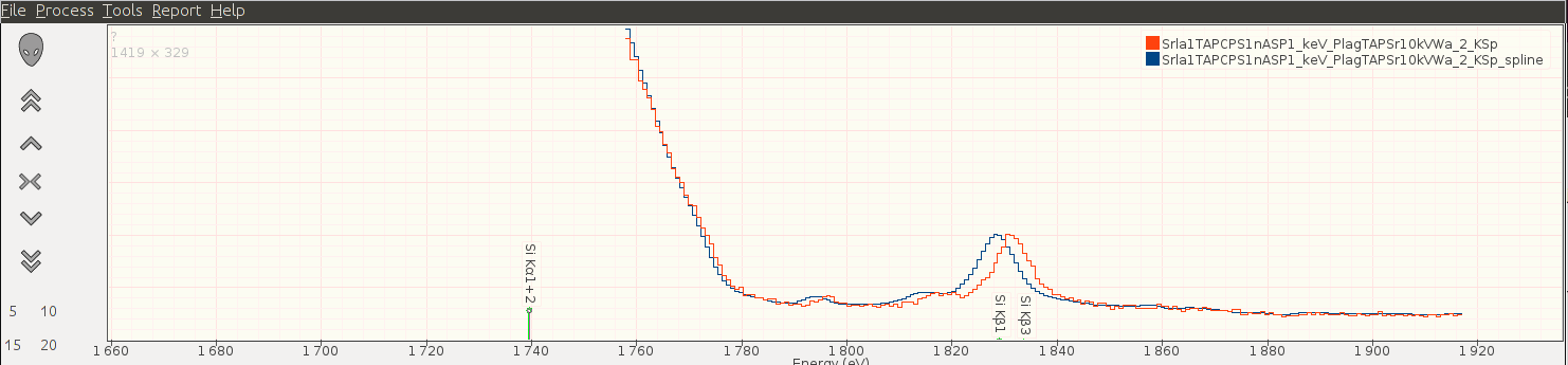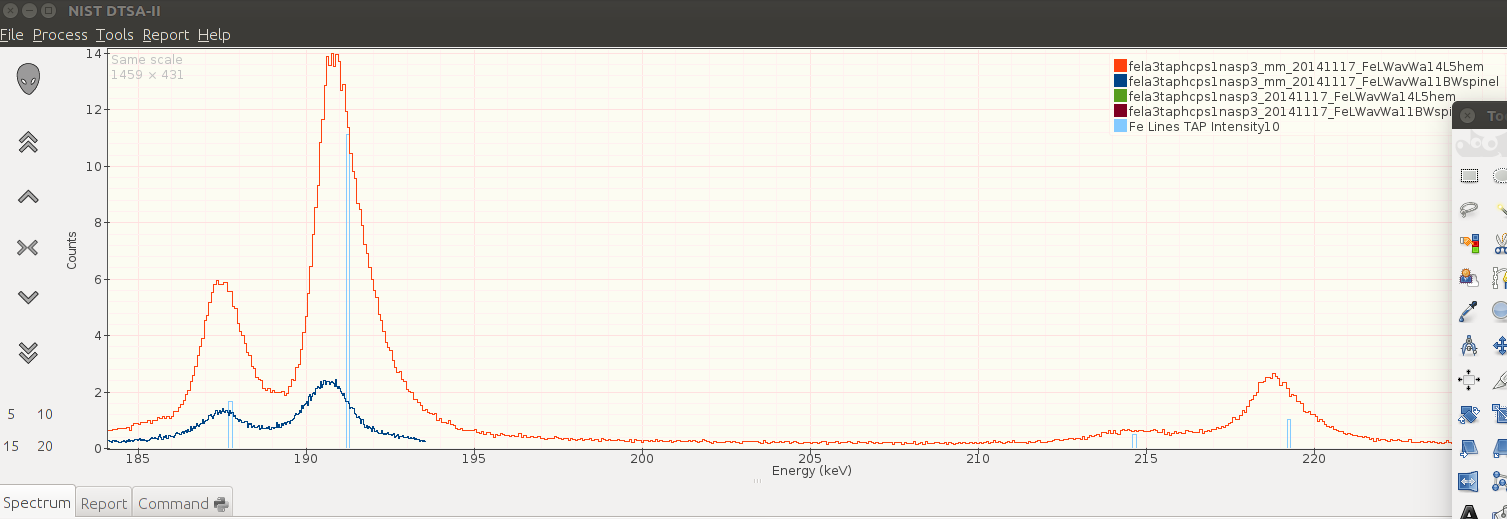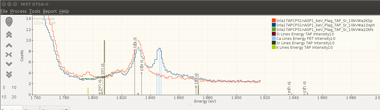 For both L value and energy I've written seperate scripts and emsa files to generate x-ray line marker spectra for the elements - the coloured columns on the graphs above. For energy the inbuilt KLM markers work but they don't include high order lines. Another quirk when viewing as energy which I didn't appreciate is that if spectra of different lengths/spacing are compared there will be a slight shift of a few eV. This is because emsa files are plot based on the step (channel) size. But when converting mm or wavelength into energy - 1 mm step does not equal a constant eV step. At the extreme's for TAP a 1mm step at 250mm = 2eV whilst at 77mm = 20eV.