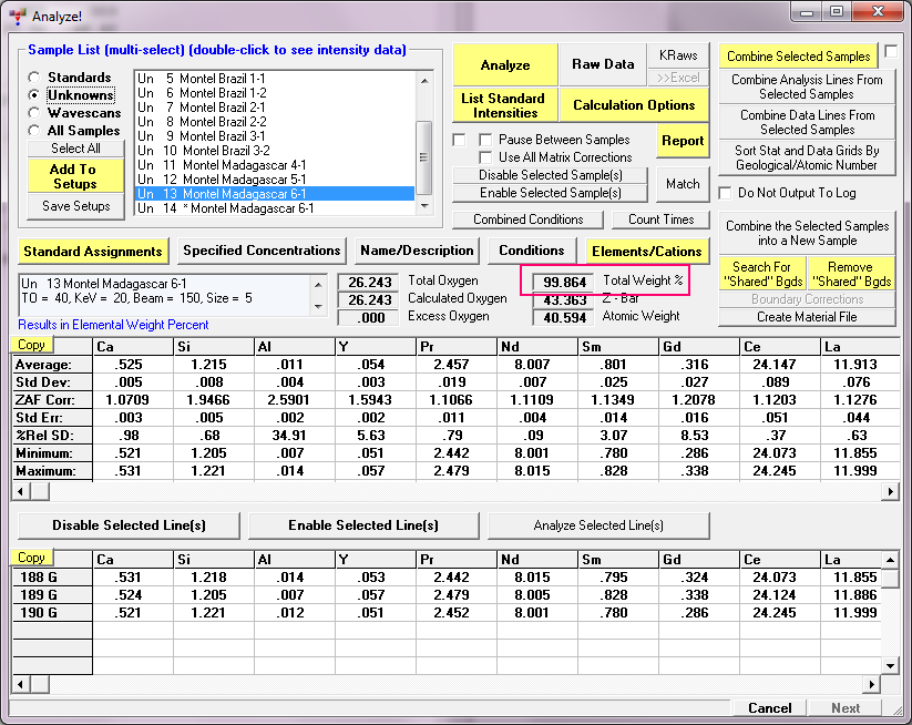 So here's my suggestion: in the window (and printout) where normalized atomic compositions are displayed, insert a column (I'd say at the far left, after the line number, so it is immediately obvious) labeled "analytical total" (with a hover box explaining what it means to the unaware).