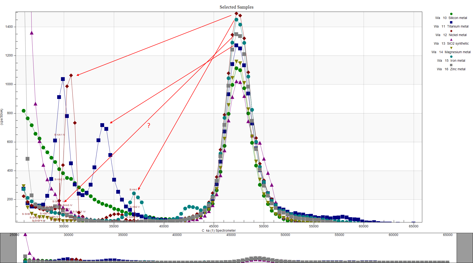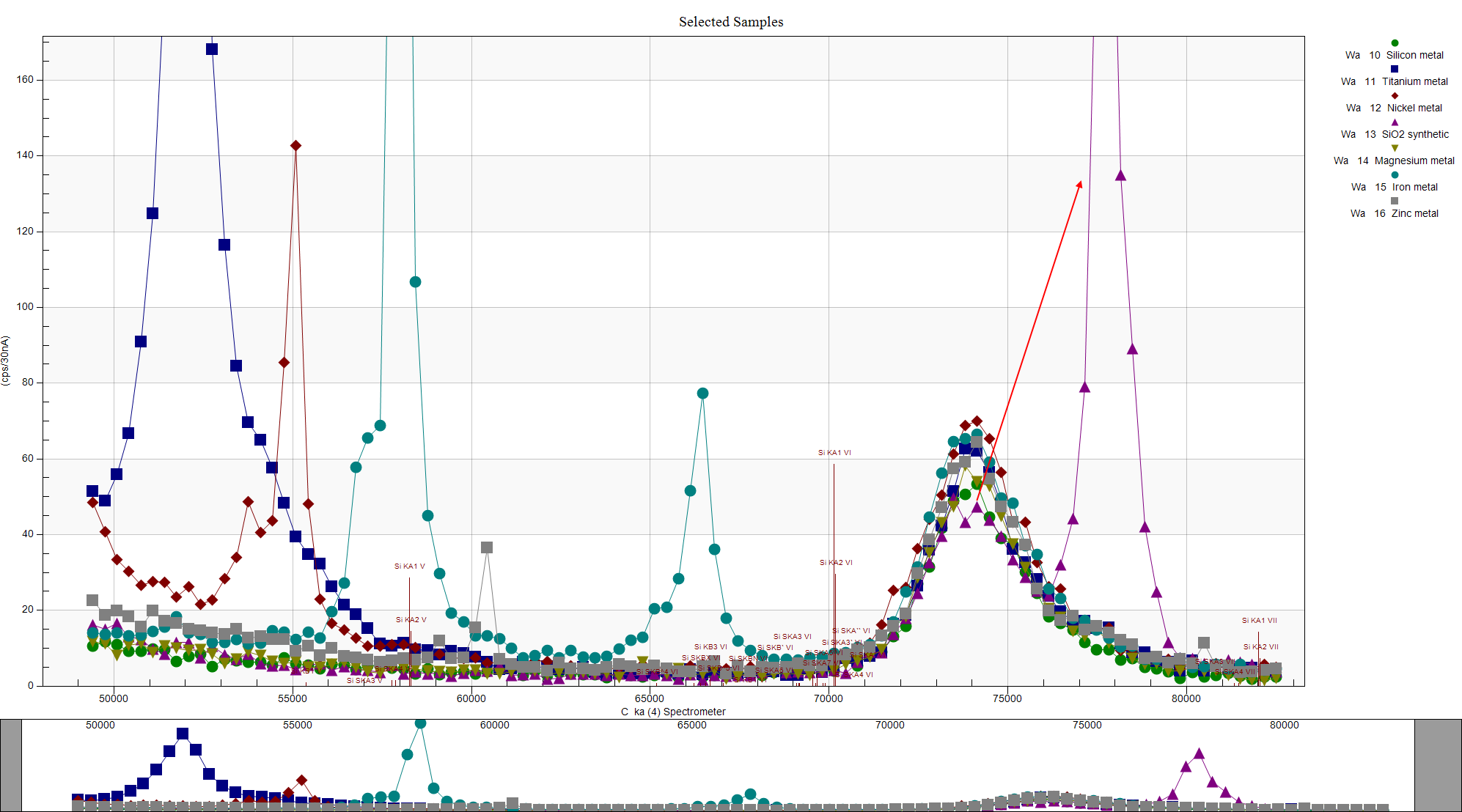 Of course my standards (all on the same mount) were carbon coated and when I analyzed them I noticed that the *apparent* carbon concentration varied tremendously and it made me wonder if some emission lines of slightly higher energy than the carbon edge could be fluorescing the carbon coating depending on the matrix metal. Here is a wavescan I did on a number of the metal samples (and SiO2) using my Ni/C PC2 Bragg crystal (the PC1 gave very similar results- though with much less intensity):