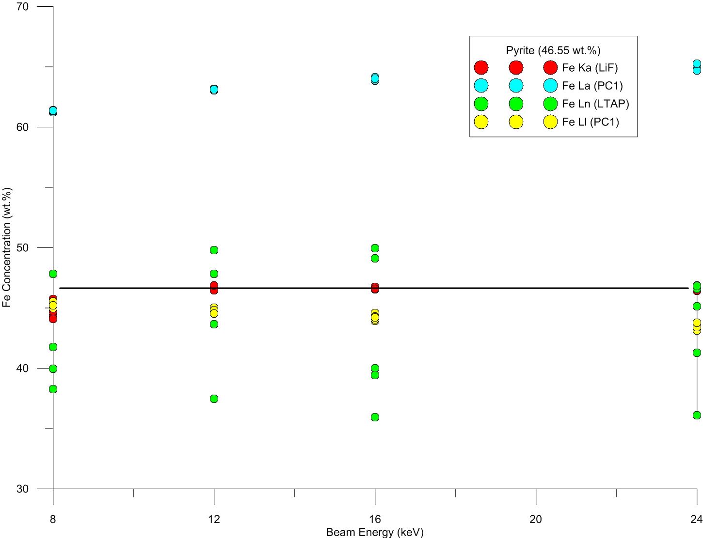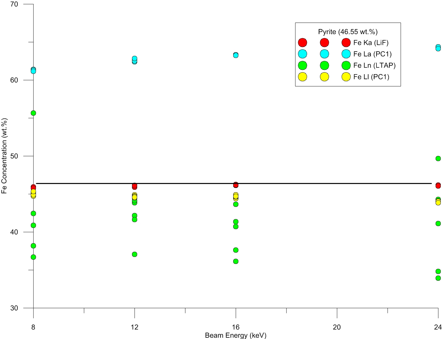 Bottom line, it all depends on which MACs one selects for the L lines, but the Ll and Ln lines work somewhat for pyrite (though not great), but all the L emission lines are really unusable for the oxide phase.  Has anybody tried using integrated intensity acquisitions for quantifying the Fe (and Ni, etc.) L family emission lines?