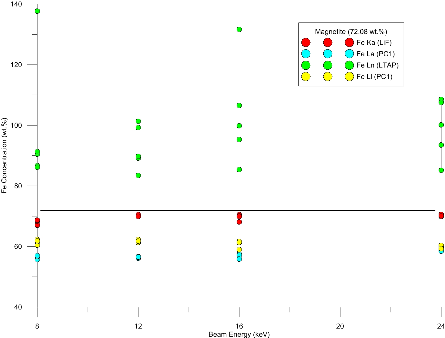 And lo and behold, there is a significant off-peak interference on the low off-peak position for magnetite (due to the tail of the oxygen peak), which at least partially explains why the magnetite quant results had larger errors. This is a nice example of why we should check our background positions in all the compositional matrices we are quantifying!