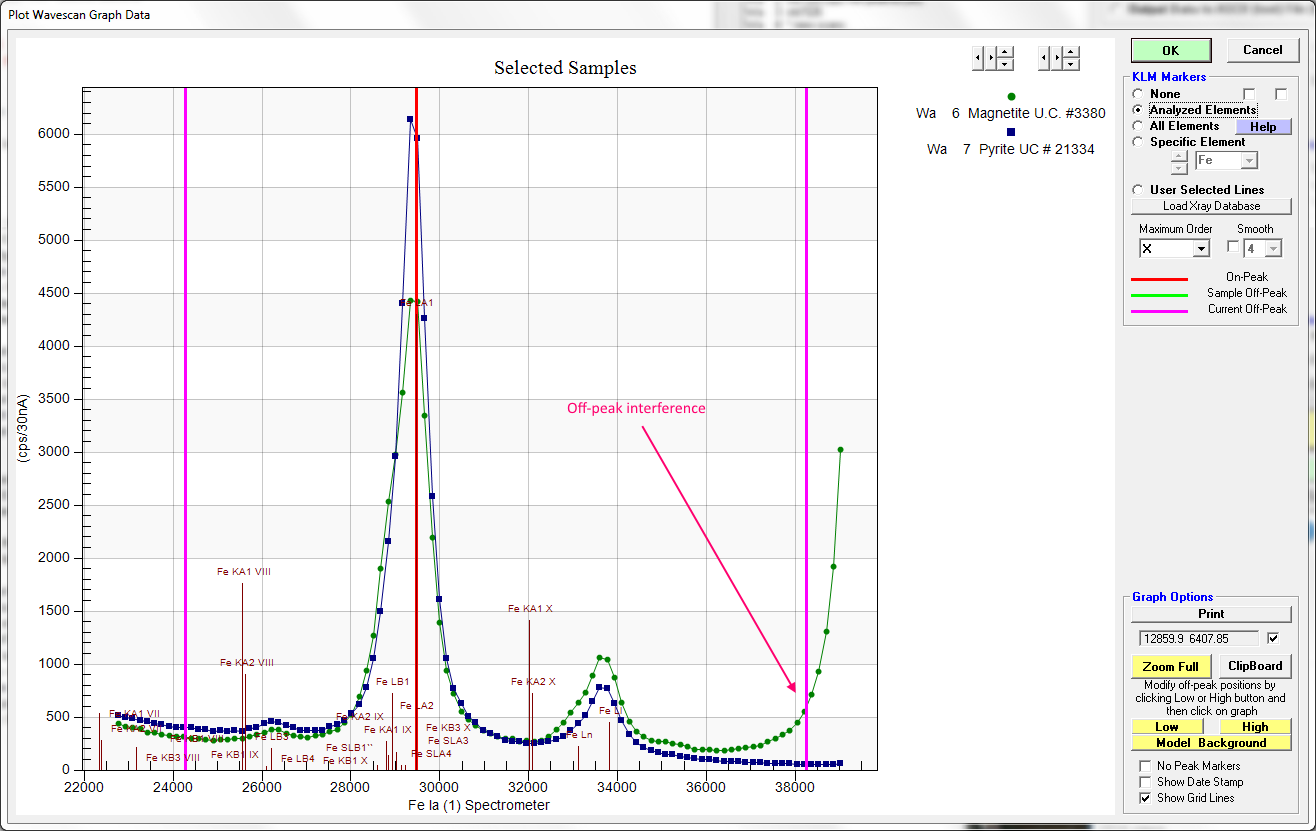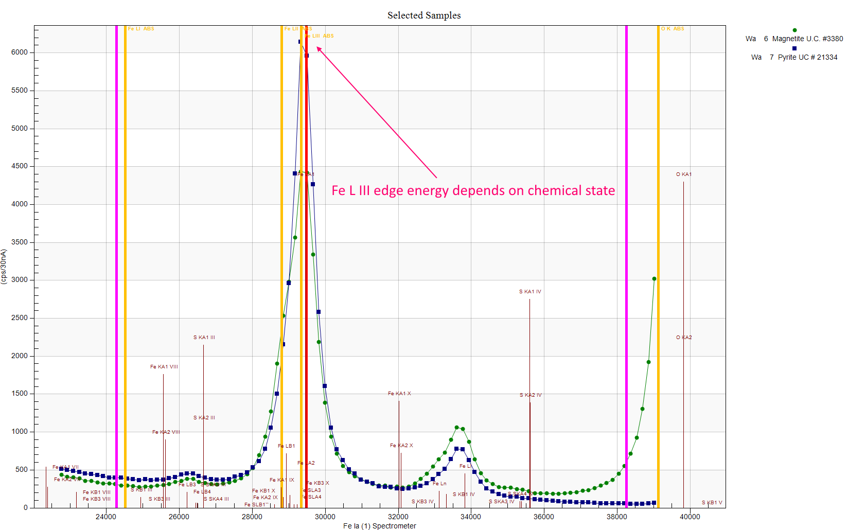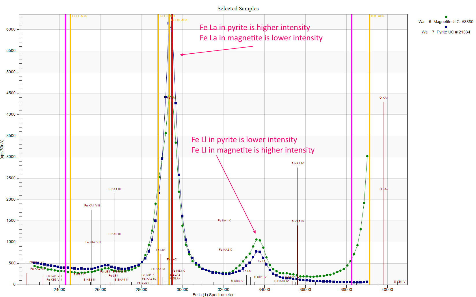Our EPMA class went back and performed wavescans on both magnetite and pyrite (our previous scans were only on Fe metal).