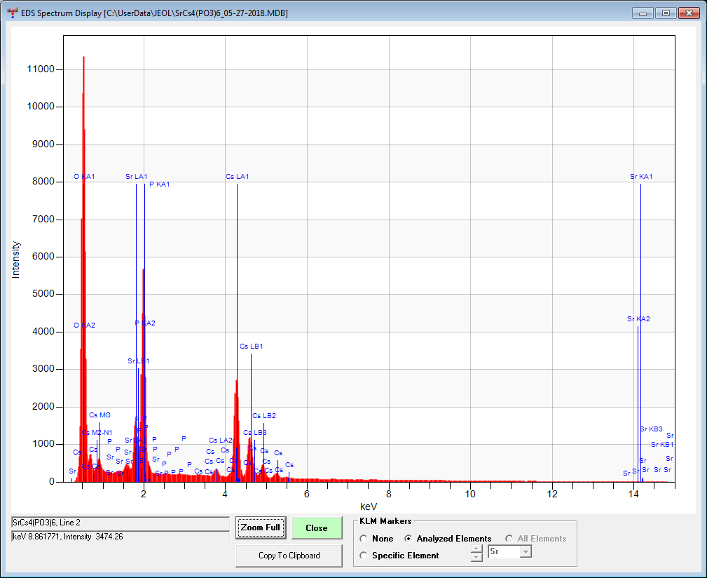 I've analyzed it quantitatively, but the combination of a lack of a reliable Cs standard and significant atomic number and/or absorption corrections for Sr and P make me reluctant to assign a formula unit at this point.  What I'm willing to state is that the formula unit is likely bounded by Sr2Cs3(PO3)7 and Sr3Cs5(PO3)11.  The first formula corresponds to wt% SrO = 18.39, wt% Cs2O = 37.52, and wt% P2O5 = 44.09, while the second, wt% SrO = 17.31, wt% Cs2O = 39.23, and wt% P2O5 = 43.47.