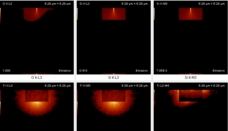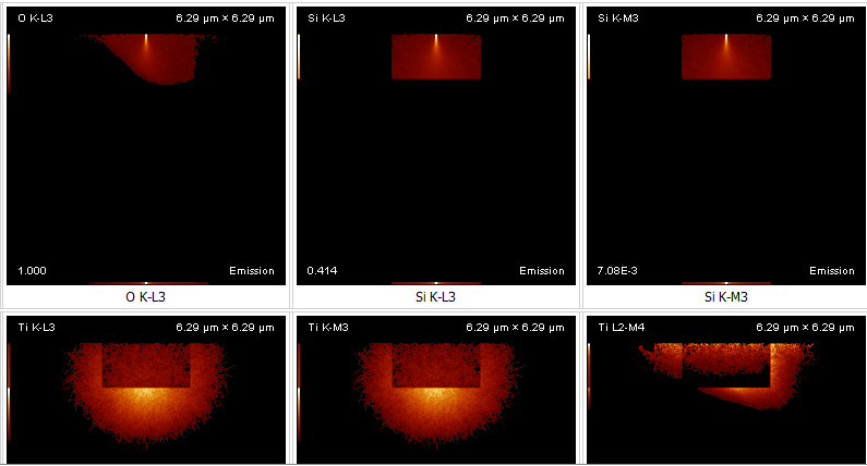 Emission plots are intergrated over interaction volume (i.e. you see x vs z, intergrated over y). But oxygen and Ti L look strange (assymetric). Ti K line makes sense the darker square is the inclusion in the middle of the interaction volume (for its intergrated over y).