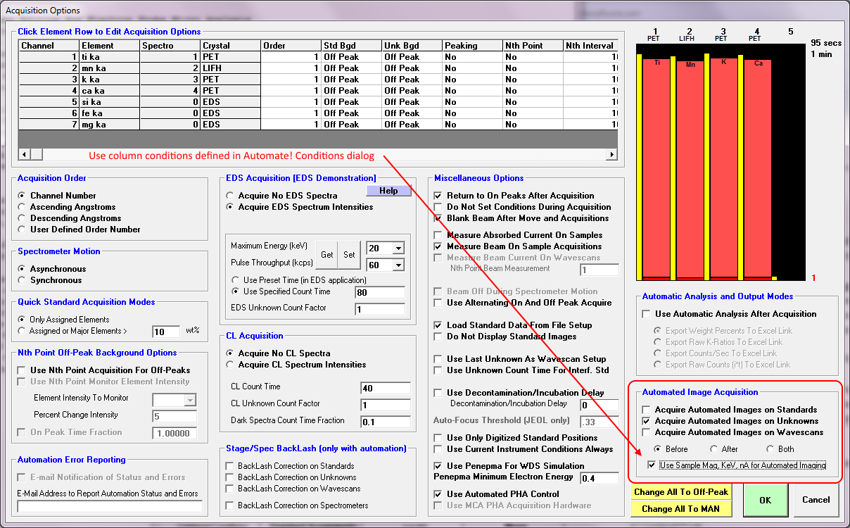 The recent changes allow one to specify different column conditions for the automated image acquisition than the conditions utilized for the sample acquisition.  Currently the imaging magnification, keV and beam current can be specified independently for analog signal acquisition with automated sample acquisition.