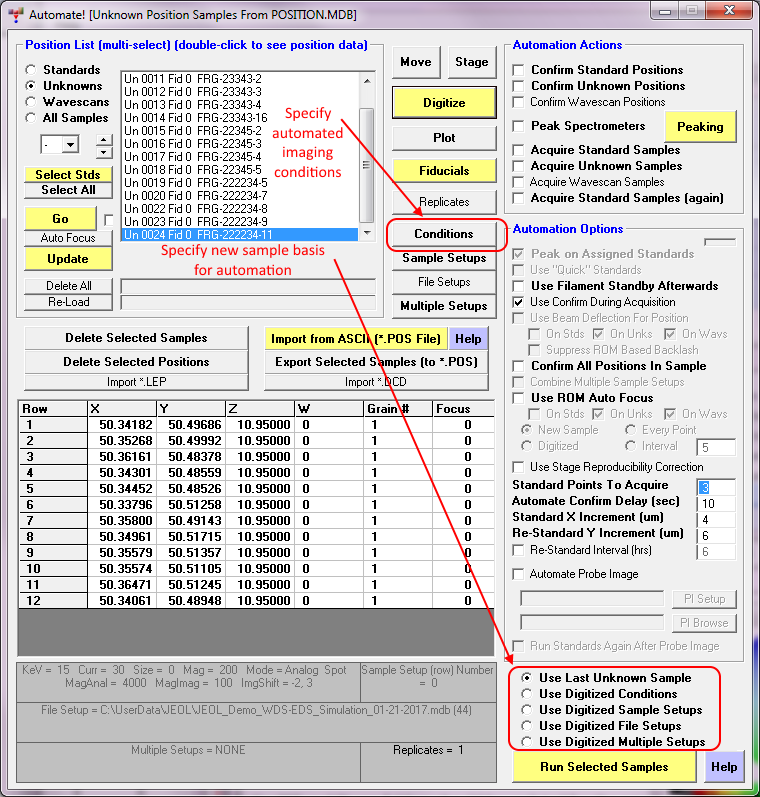 Note that the Use Sample Mag, keV and nA for Automated Imaging checkbox is checked.  If you hover the mouse over the checkbox you will see that the "sample" it is speaking of is the *position* sample conditions as specified in the Automate! window as seen here: