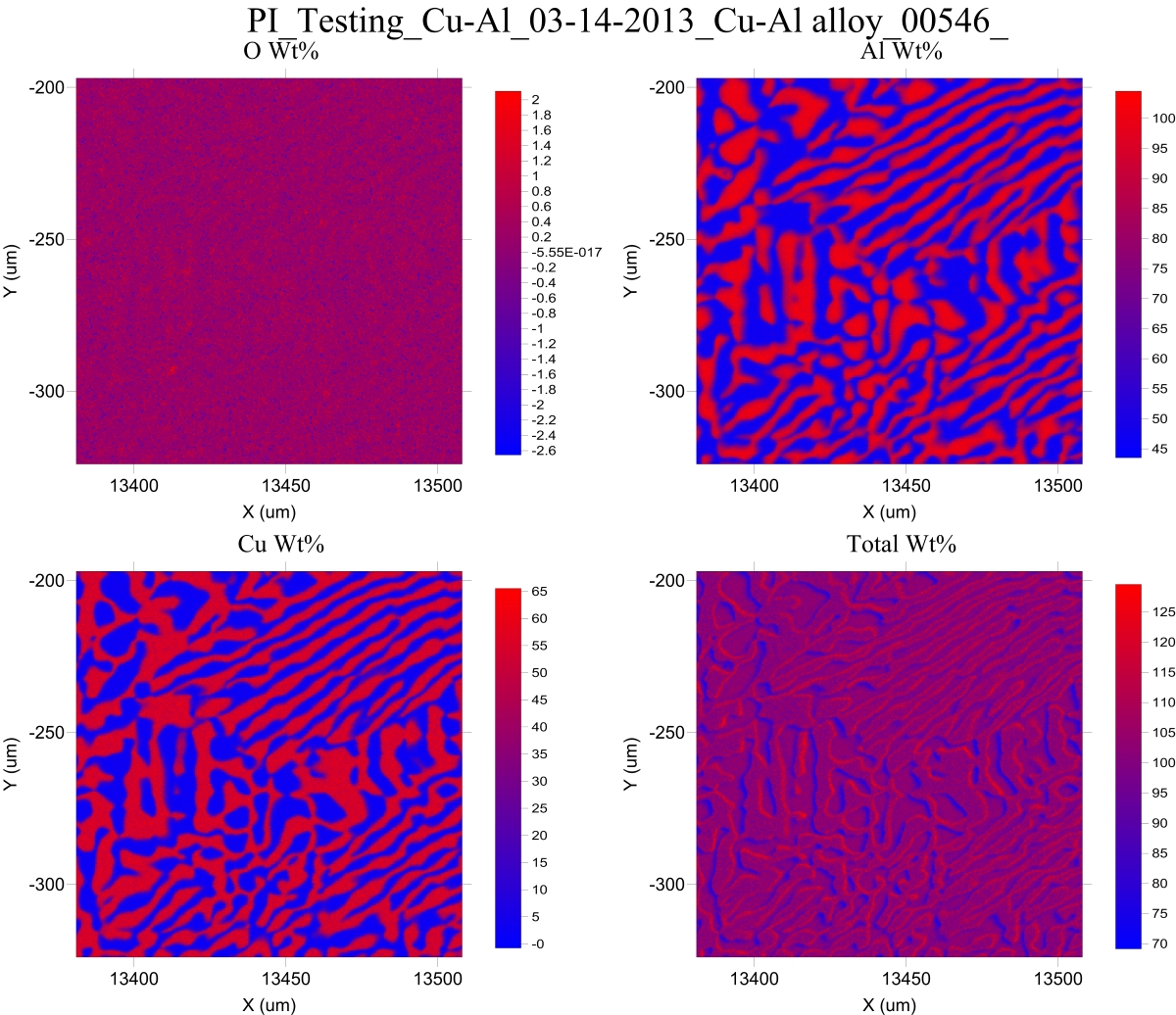 Think of it this way: at the boundary between pure Cu and pure Al, the instrument is seeing the x-rays from both copper and aluminum, but almost all the Cu Ka x-rays are being emitted from pure copper, and almost all the Al Ka x-rays are being emitted from pure aluminum. So instead of applying a matrix correction of around 1 to most of the emitted x-rays, because our bulk matrix model assumes the sample is roughly a 50:50 composition, we get an severe over-correction for Al Ka because the physics model says that the matrix correction for Cu and Al in an alloy is around 1 for Cu Ka, but around 1.5 for Al Ka! This may be part of the reason why we get this odd looking *totals* map in a Cu-Al eutectic map: