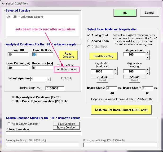 is key to this situation.  Basically, when this box is checked (in the Analytical Conditions dialog in PFE), whenever an acquisition or automation completes, the software re-sets the beam size to zero.  The idea being that one can then simply unblank the beam and image with a fully focused beam. This is the default mode in PFE as many of you already know, but it essentially has no effect if the default beam size is already zero (fully focused).