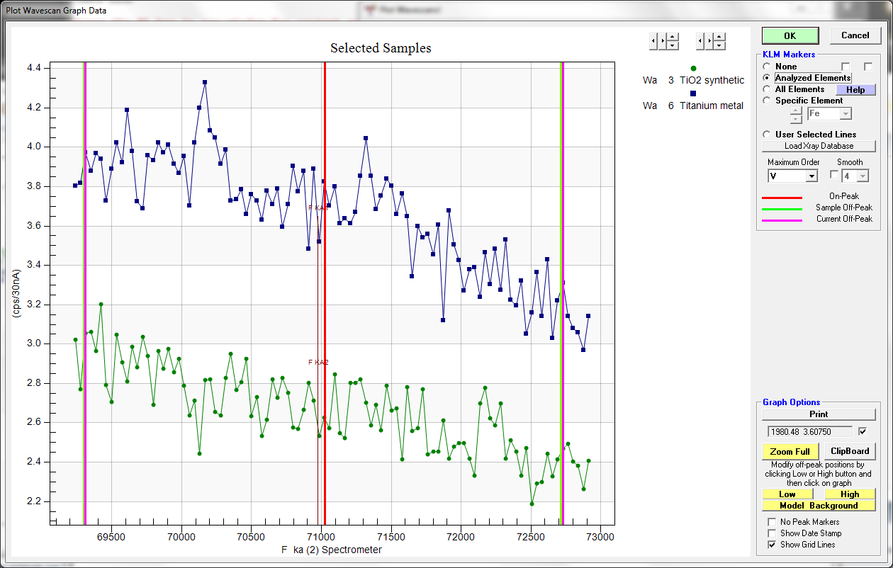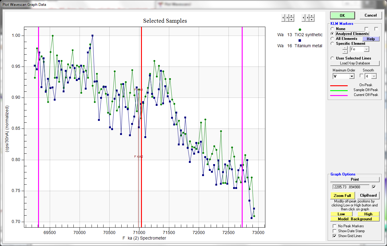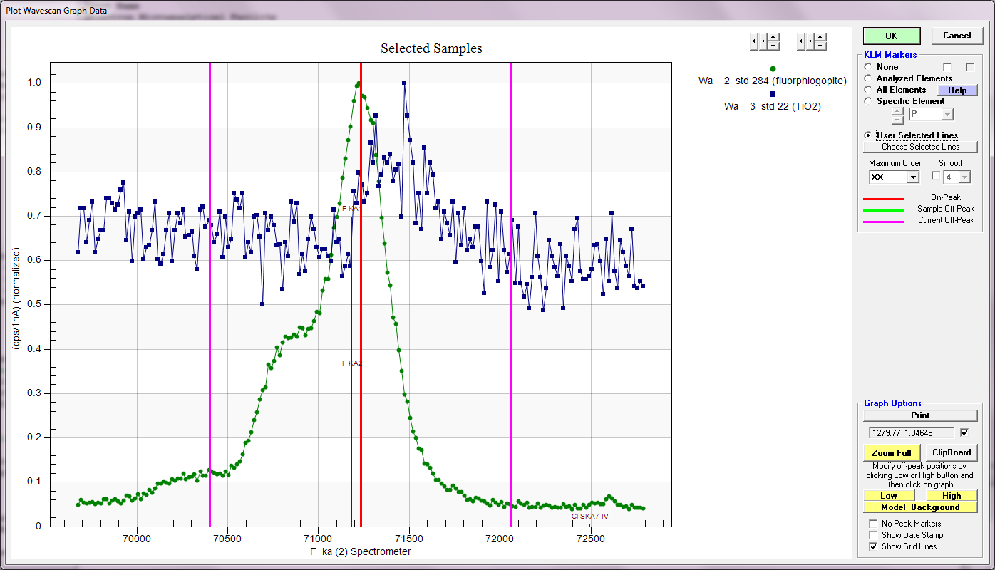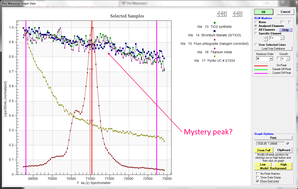 Here is a plot of fluor-phlogopite and TiO2 normalized intensity.  I wanted to see if I could say whether the mystery line was a first order emission line or not: