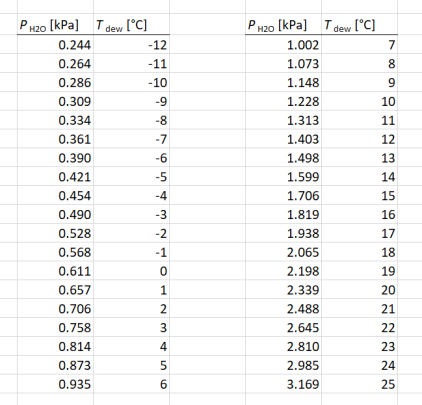 PH2O [kPa] = 0.611 kPa * 10^((7.5 * Tdew [°C]) / (237.3°C + Tdew [°C]))
