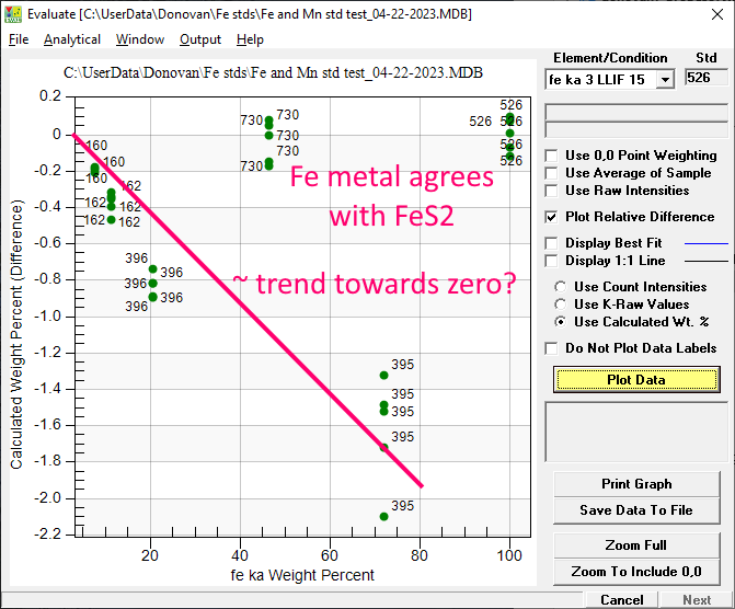 But then, thinking about it a bit more, I think this hypothesis fails for two reasons. First, my Fe metal standard is a 0.1mm wire that is mounted vertically and cross sectioned, so I think the magnetic field from this standard is quite minimal.  Second, and more importantly, the pyrite standard is non-magnetic just as the oxides and silicates, yet pyrite analyzes perfectly using the Fe metal primary standard.