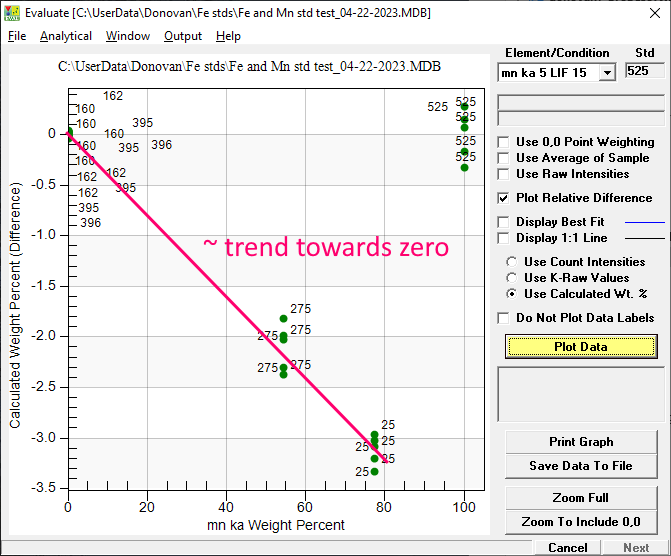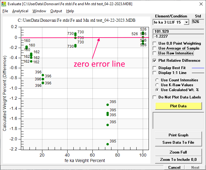 As you can see, the pyrite standard agrees excellently with the Fe metal primary standard, but the oxide, silicate and glass standards show a consistent error trend (in absolute wt% units) as one would expect if this is due to a systematic error.  Here is the analysis of magnetite: