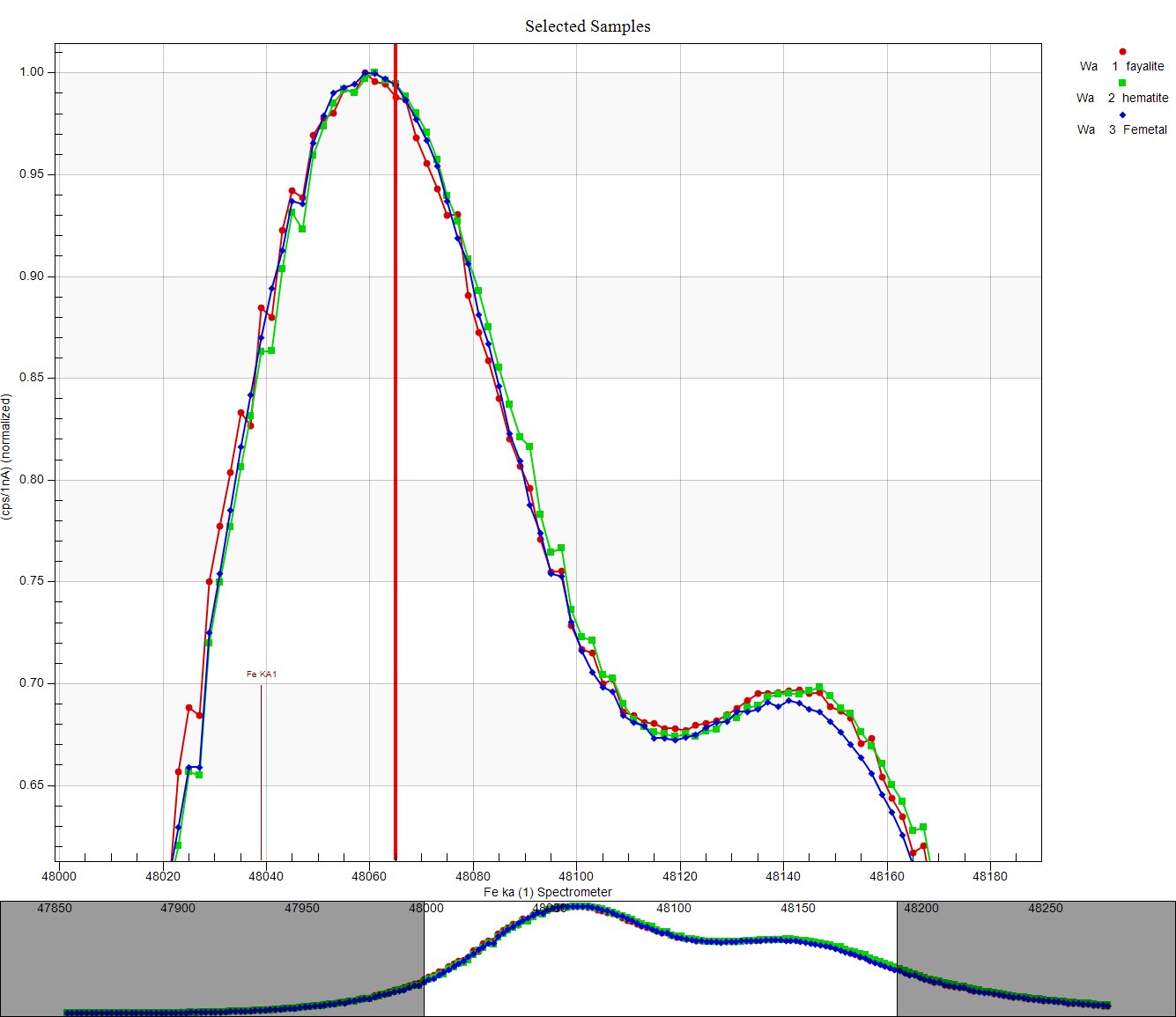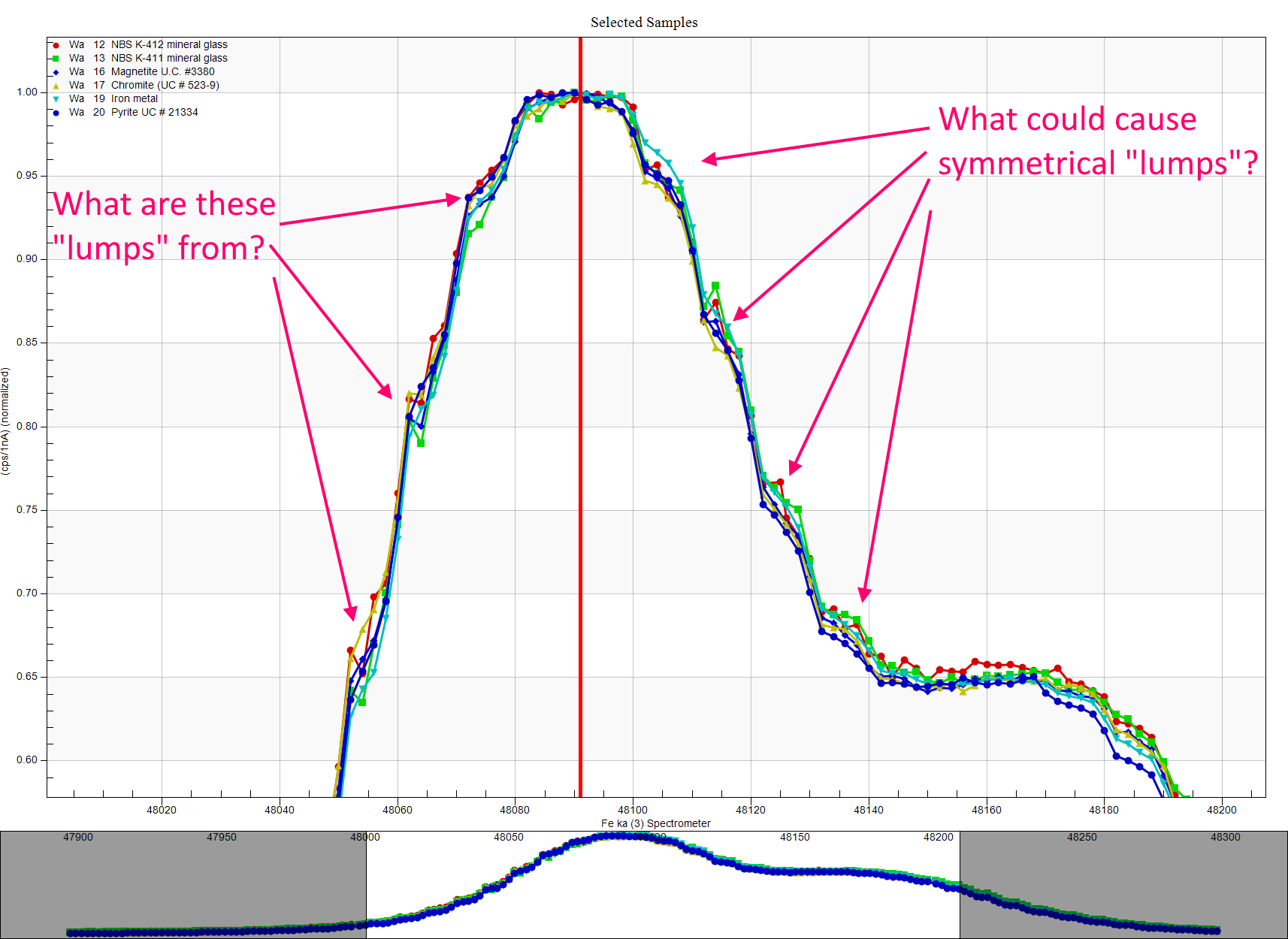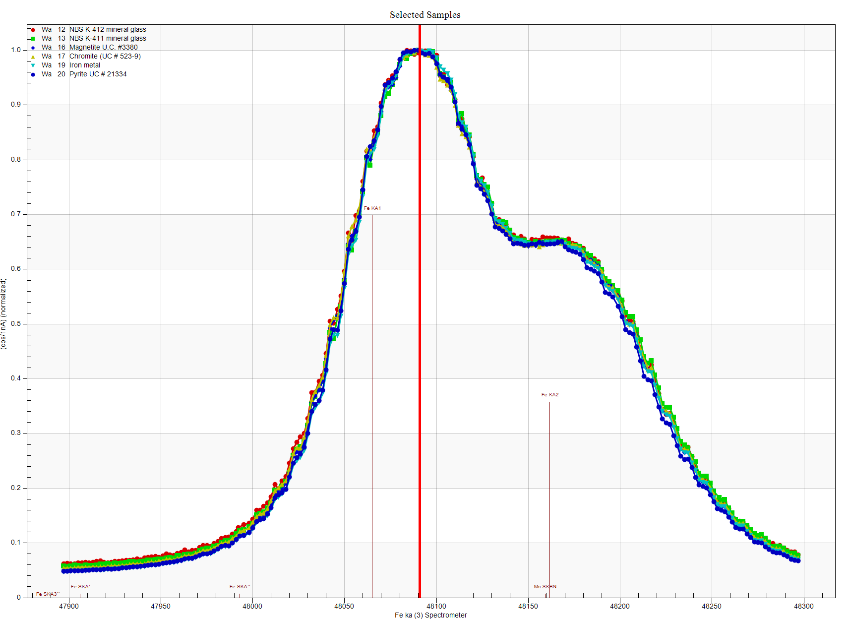 Now let's examine some high precision wavescans I did over the weekend starting with Fe Ka on the standards containing major concentrations of Fe: