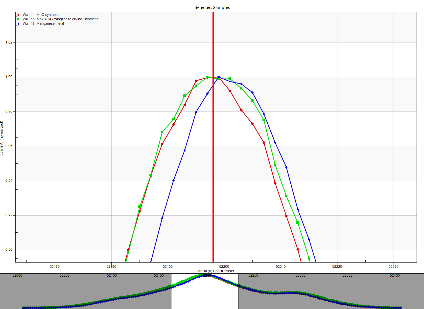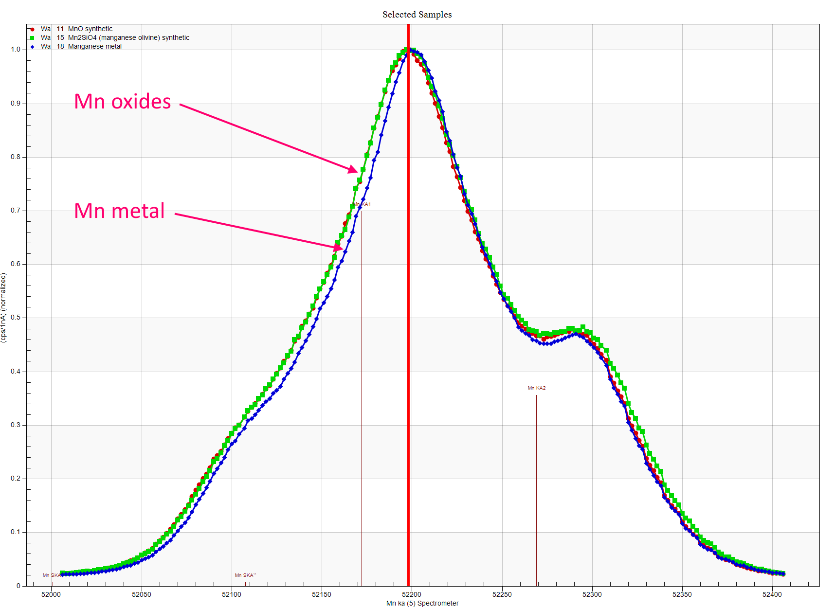 But now let's look at the Mn Ka scans on Mn metal and a MnO and Mn2SiO4 secondary standards: