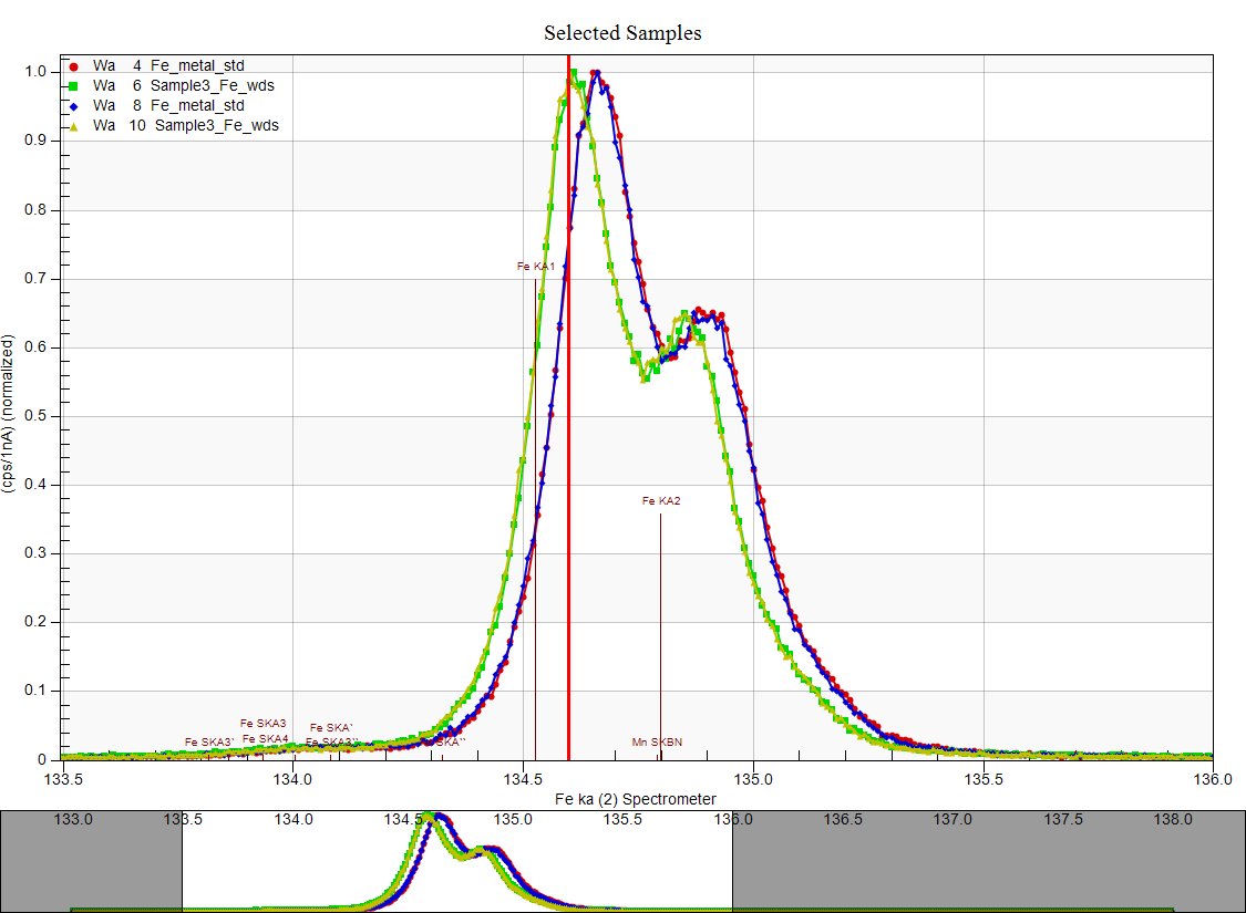 That's two WDS scans on each phase, going standard-sample-standard-sample, using the same conditions on the same spectrometer. Count rates weren't particularly different between sample/standard. Wasn't expecting such a shift in the Fe Ka, and never really got to the bottom of what caused it!
