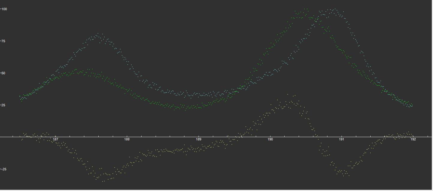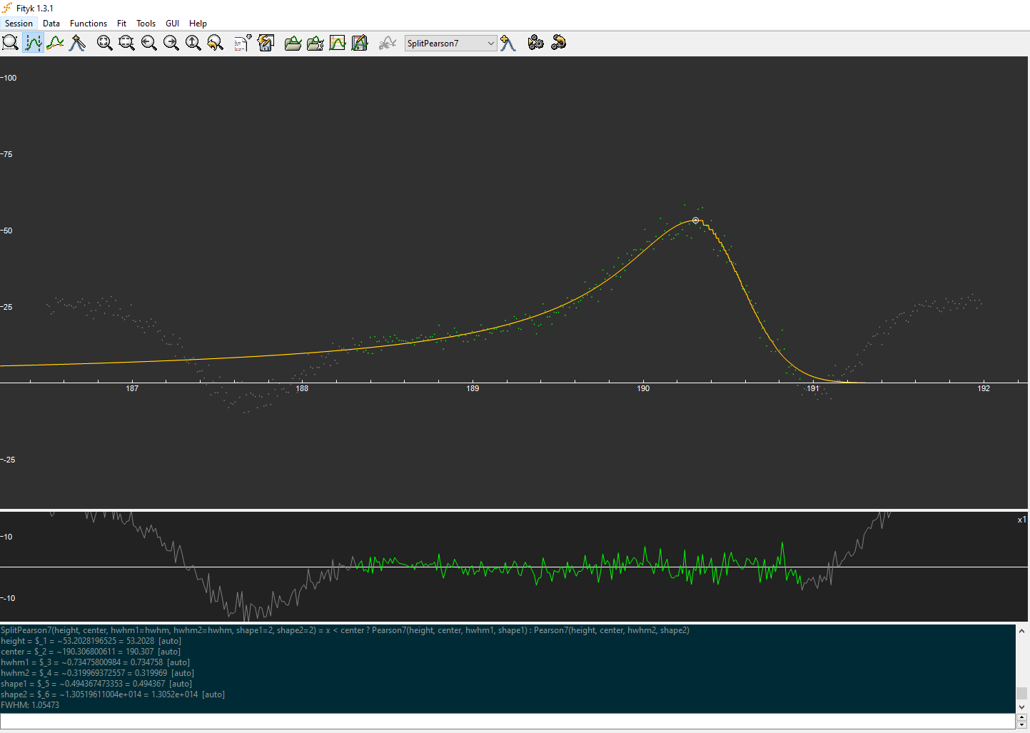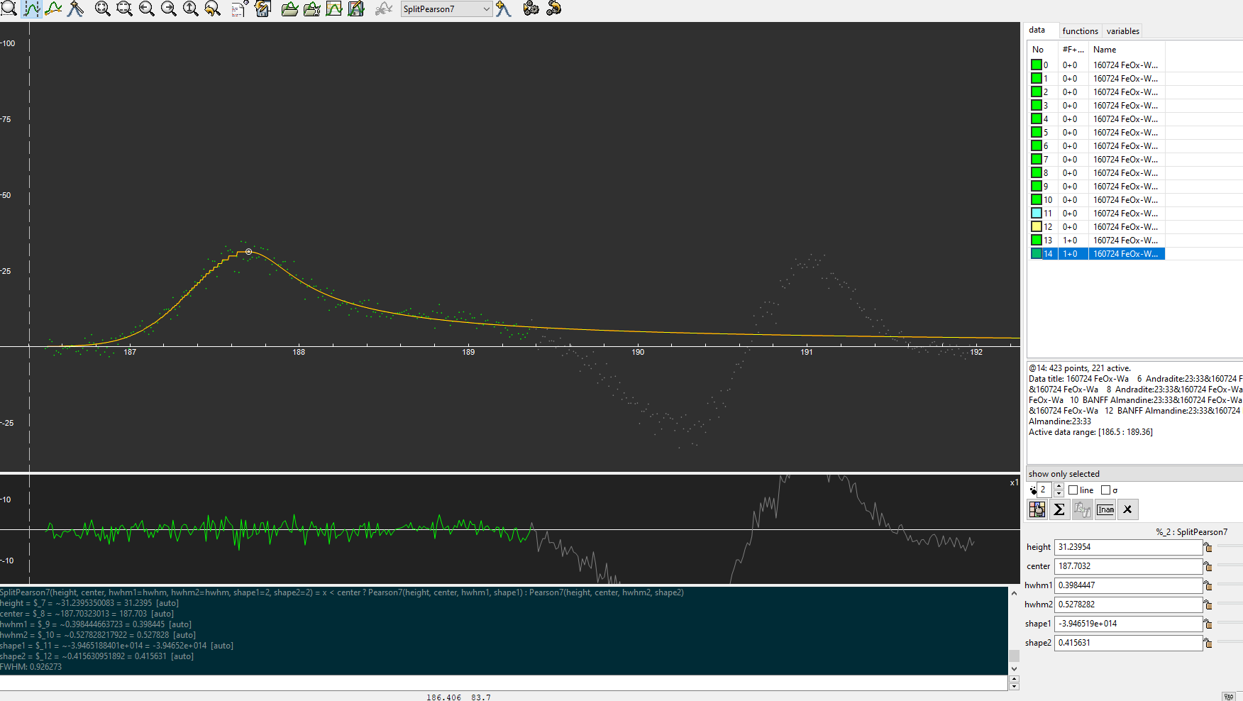 (8.) Fit peak to the maximum difference and identify centroid giving a flank position - it only fits peak to positive values so shift spectra to positive values using edit transformations - add new function Y=y[n]+25 - using data-range mode deselect parts of spectra not relevant to fitting - select split pearson7 - auto-add - start fitting - either write down centre of fitting peak (the flank position) or Functions>Export peak parameters