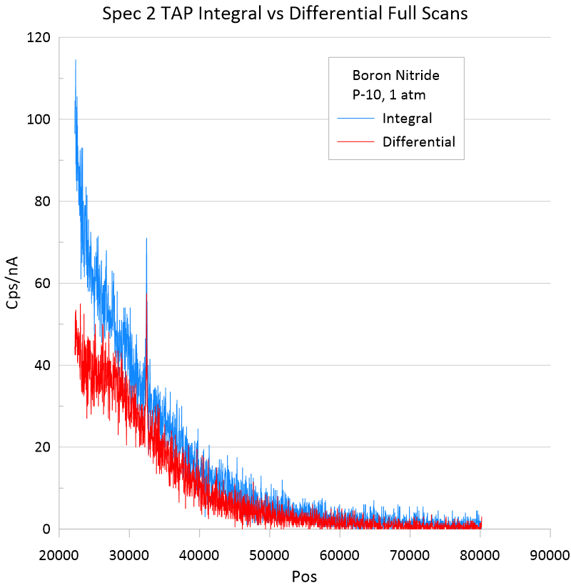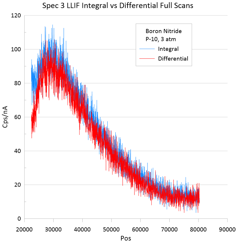 That generally means leaving our baseline values at the lowest possible settings, e.g., ~0.2v for Cameca and ~0.5v for JEOL. And if one absolutely must utilize DIFFERENTIAL mode, then leave the window levels at ~4.5v for Cameca and ~9.5v for JEOL.  The idea being to obtain a linear response of intensity with concentration (and/or beam current) as much as possible, and then have the quantitative spectral interference correction do its job!  Remember, for 1st order spectral interferences, the window level filtering has no effect at all, except for a few stray cosmic rays!   ;D