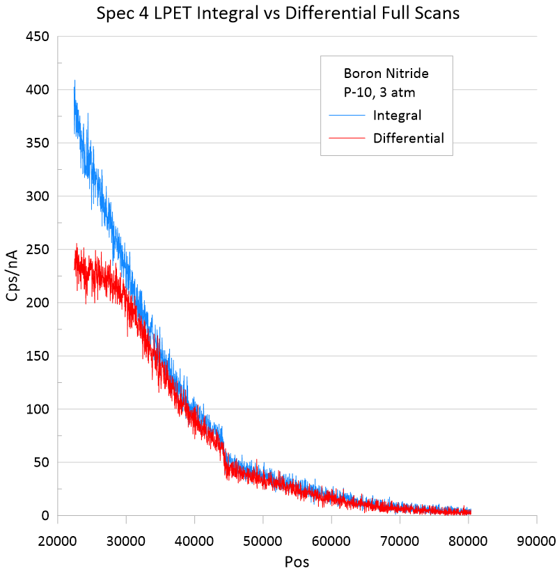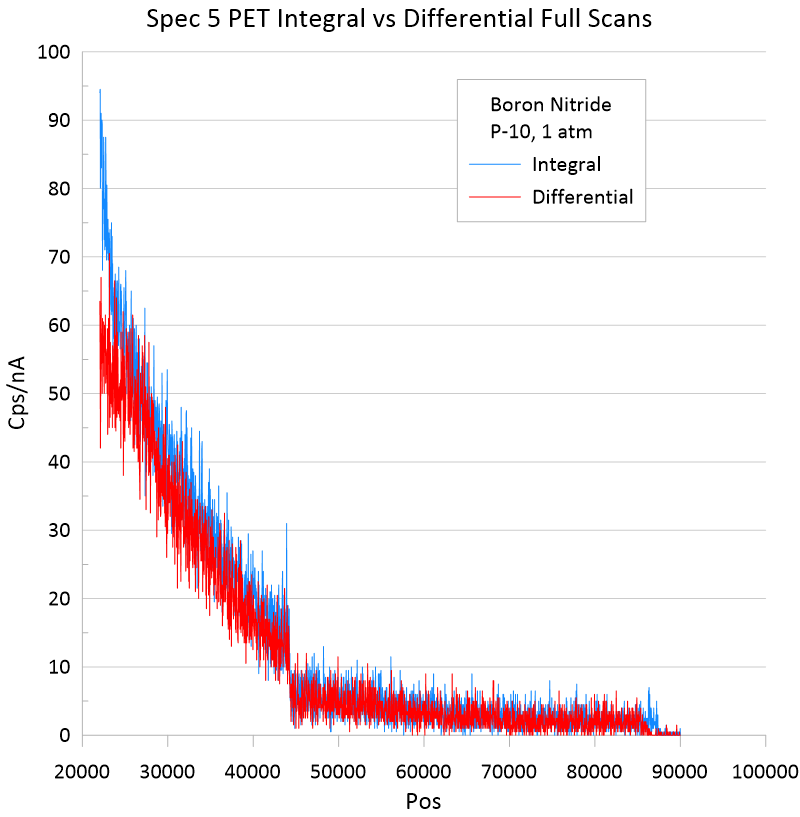 But again, there is generally no reason to utilize PHA DIFFERENTIAL mode at all, except possibly in rare cases where a high order (<1) spectral interference is present, and no suitable interference standard is available. Remember, the quantitative interference correction requires a standard with a known concentration of the interfering element, and *none* of the interfered element (nor any other interfering elements).  I can only think of the interference situation of Na Ka 2nd order interference on O ka, and that is because it is difficult to find a standard material that contains sodium, but no oxygen.  I've tried natural cryolite for this interference correction, but it seems to contain some oxygen, maybe from surface reactions.