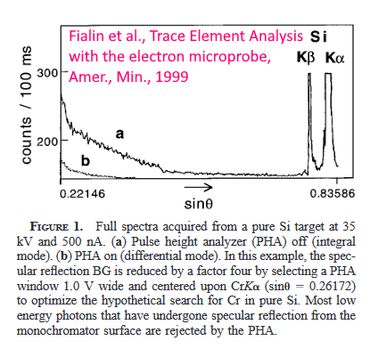 Also it makes clear we have these specular reflection on 20k-30k cameca sin theta positions. Remember that weird behaviour as we looked for D-H limit with WDS scans? Where this intensities with slope apeared over energy of beam of 10kV? My PHA investigation in that setup showed some nonsense (no high energies) and Narrow window with PHA diff could not cut that artifact out. Specular reflection at 30k to 20k makes sense as it is wideband photon noise.