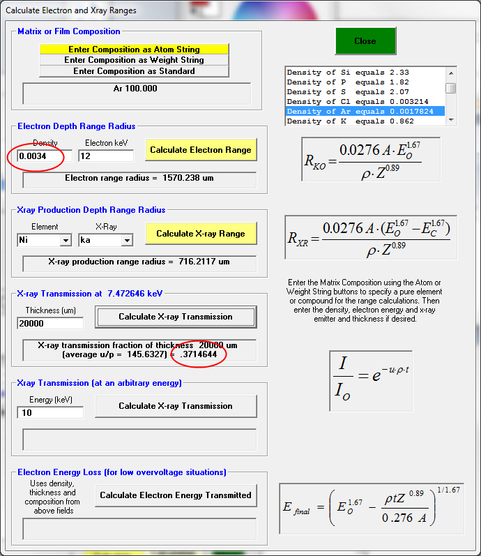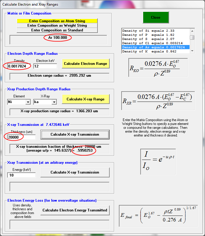 I thought that was odd because I'm running Ti Ka at what might be considered an "ideal" overvoltage, e.g., 2.4 for Ti Ka versus 1.4 for Ni Ka (both run at 12 keV). Also, it is well known that on Cameca Ar detectors, even with the increased 2 atm gas pressure, a significant fraction of high energy x-rays will go through the gas absorption path without getting detected. To be fair, because they are flow detectors as opposed to sealed detectors, they are very clean and low noise, but if one assumes an 2 cm absorption path of Ar at 1 atm, about 60% of the Ni ka x-rays transmit through Ar as seen here in this dialog from our CalcZAF utility: